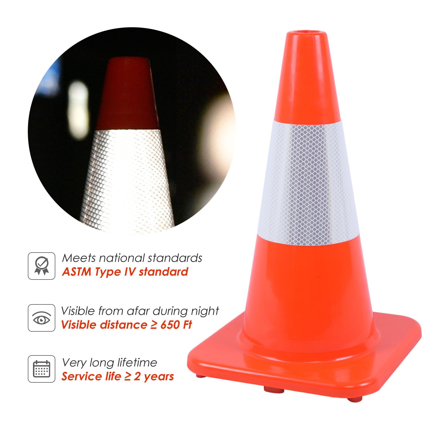 - MUTCD-Compliant & Built to Last --- Designed specifically for U.S. road standards and harsh weather conditions, this cone meets MUTCD specifications. Its robust construction ensures reliable performance for 3+ years, making it a cost-effective safety solution for traffic control, construction, and events.