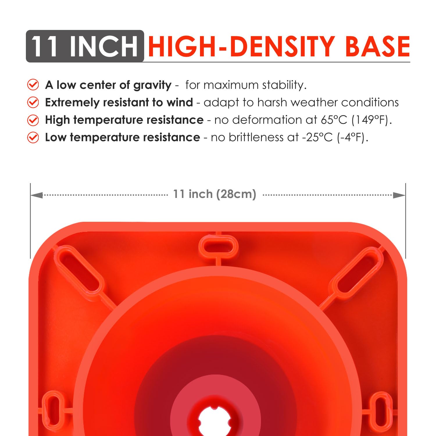 - One-Piece Molded Design --- Unlike traditional cones with separate bases, this traffic cone is integrally molded from a single material. This eliminates the risk of the cone and base separating, ensuring long-term durability and reliability in all conditions.