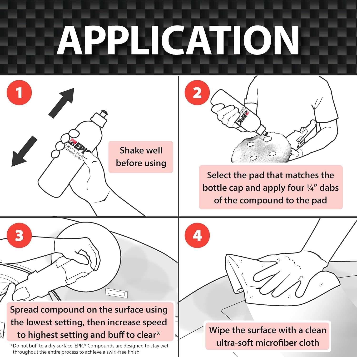 - DUST-FREE, SWIRL-FREE CAR COMPOUND: The EPIC Heavy-Duty Compound offers a dust-free application, keeping your workspace clean and efficient. It provides a swirl-free finish when used with the correct orbital pad, such as the Epic Purple Wool Heavy Duty Pad or the EPIC Gray Foam Heavy Duty Pad. This car buffing compound ensures that your vehicle's paint remains smooth and shiny without any unsightly swirl marks, delivering a professional grade result every time.