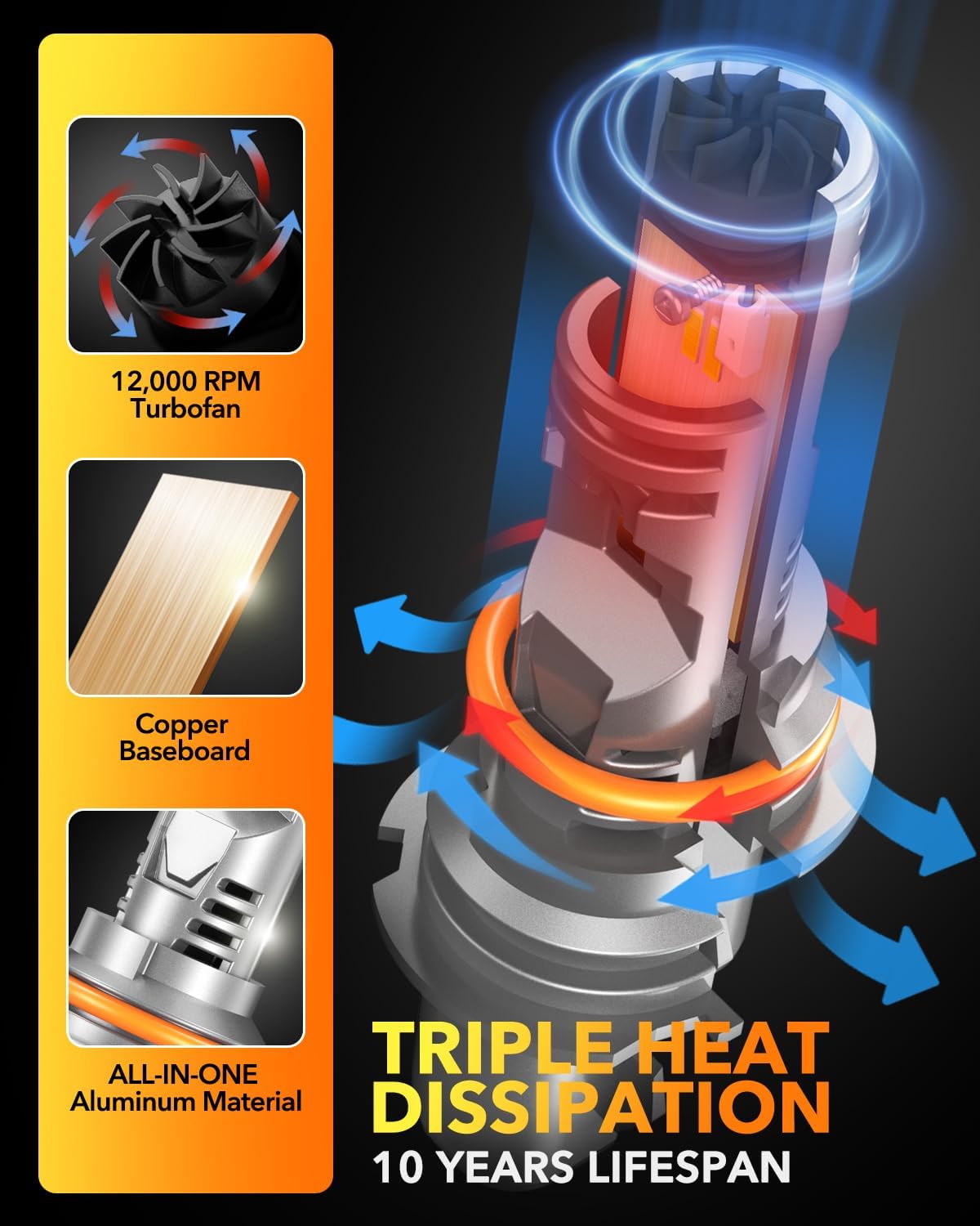 - 【Triple Cooling for 50,000 Hours of Lifespan】: OXILAM 9004 lights use excellent heat dissipation technology: one-piece aviation aluminum body, high-quality copper plate and 12000rpm silent turbo fan, which can effectively dissipate heat quickly, thus ensuring a lifespan of 50000 hours. Say goodbye to frequent replacement of halogen bulbs.