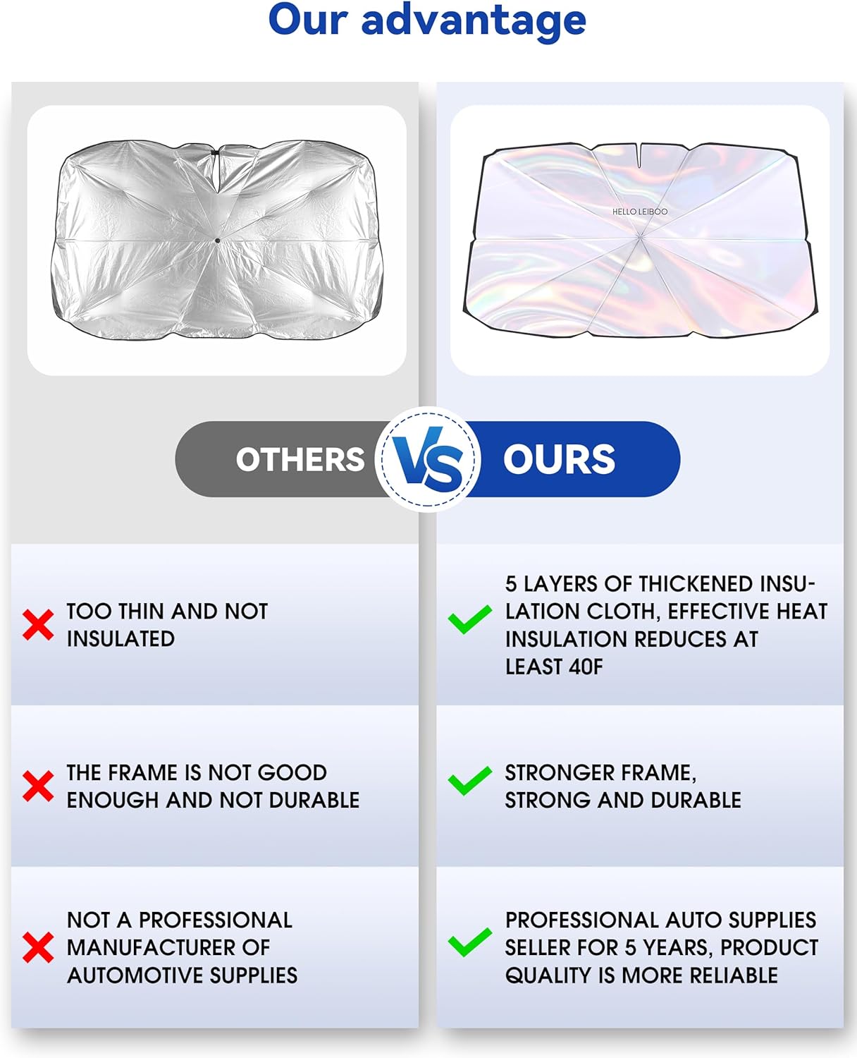 - 【STORABLE DESIGN SUN SHADE FOR CAR WINDSHIELD】:This windshield parasol comes with its own storage bag and convenient buckle, you can easily fold and secure the belt, you can easily store the parasol in the glove compartment or trunk when not in use, to avoid debris accumulation. For family or friends with a car, this must be a thoughtful product.If you find that the size does not match after a trial on the car, we promise to send you a more suitable size. Note: Please measure your windshield size before purchasing, If you encounter any problems, feel free to contact us.