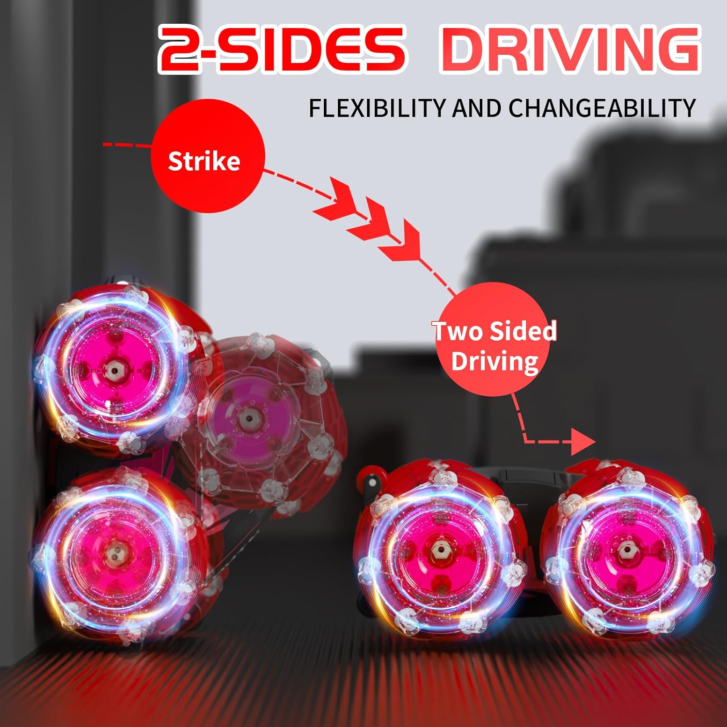 - RC double sided car: convenient for charging at home, power library, computer, etc. Provide lasting fun for your child. The remote control uses two 1.5V AA batteries (not included)