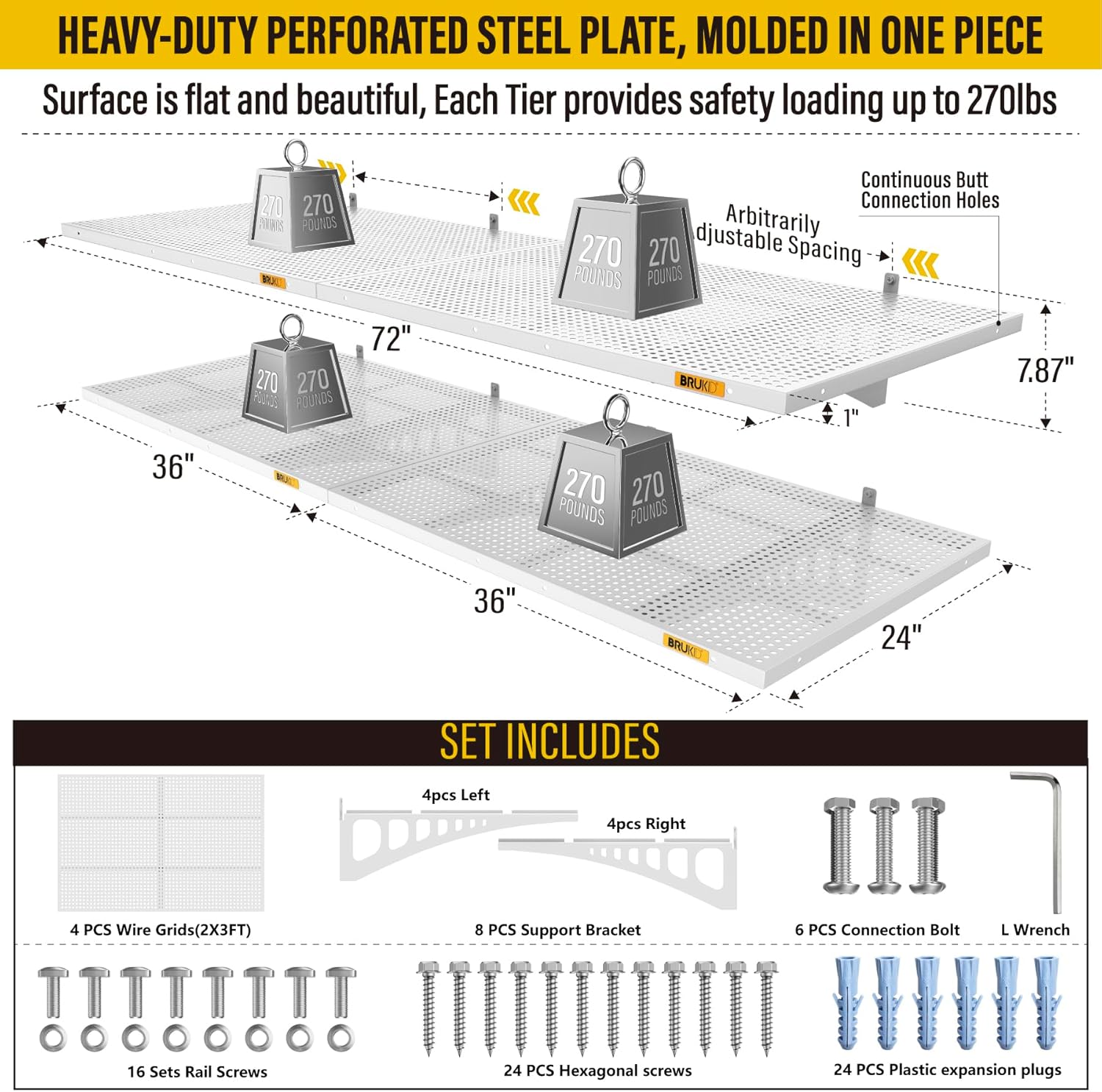 - KIT INCLUDES: Includes 4pcs of face plate; 8 Brackets; 24 Hexagonal screws (Hardened â 0.2" L/2"); 24 plastic expansion plugs, 16 Sets of rail attachment bolts; 1 L-wrench; 1 installation manual. All the hardware of Brukid professional series wall mounted shelves are under strict quality control and testing, we strive to provide our customers with a quality shopping experience, when you receive the product encountered any problems, please contact us at the first time, we will certainly give you a satisfactory solution