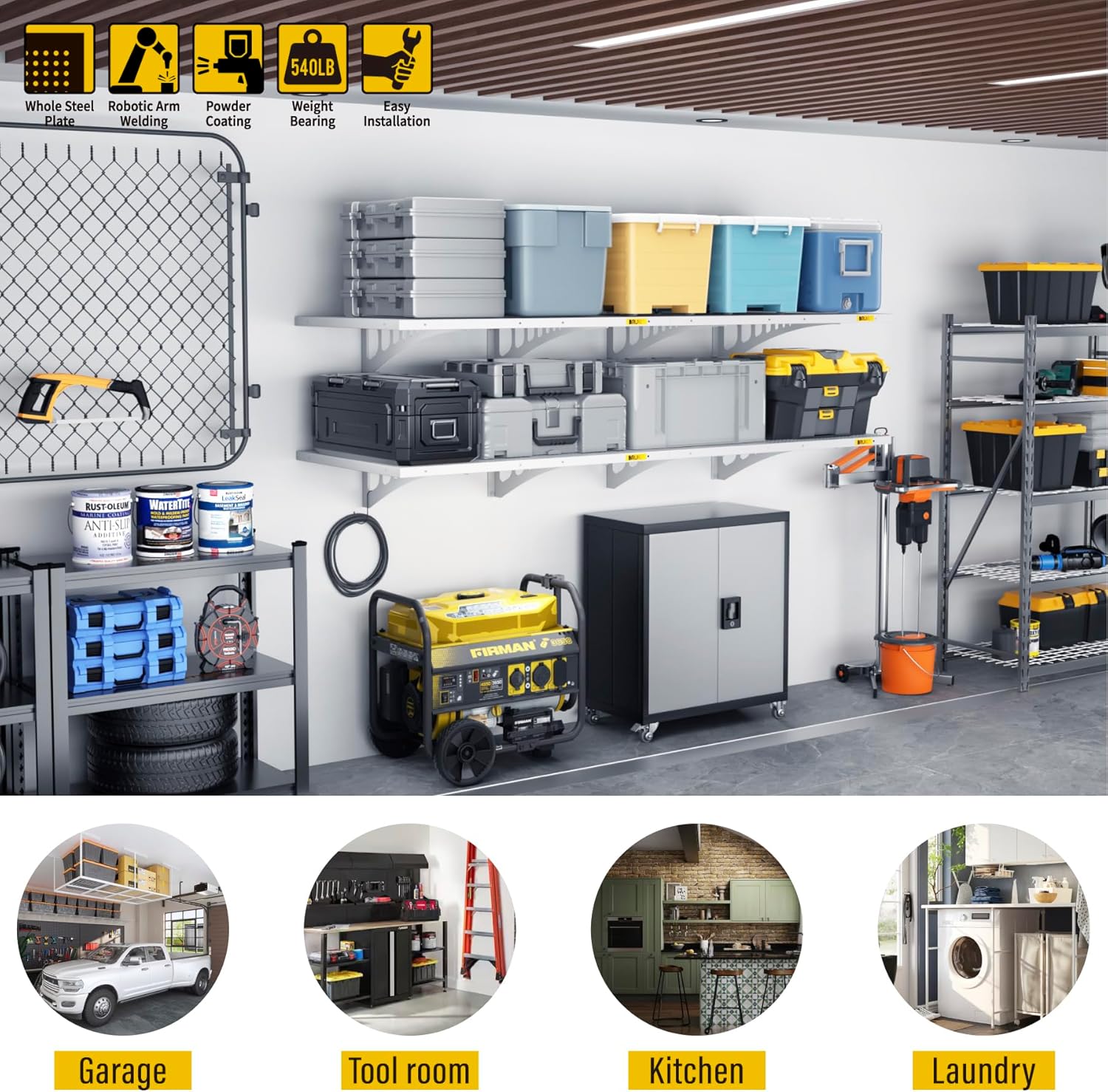 - SUPERIOR DESIGN: Wall shelf garage storage rack panel is made of whole piece of perforated steel plate bending and welding, the surface of matte high temperature powder baking paint, flat and smooth; the panel adopts slide rail design, can be adjusted by parallel left and right sliding at will; bracket can be freely installed in 33â range of the spacing of the wood wall keel, without affecting the precision connection with the panel, eliminating the worry of being unable to docking due to the mismatch of spacing points of load-bearing wood wall keel or inaccuracy of the installation of the bracket. It saves time and labor