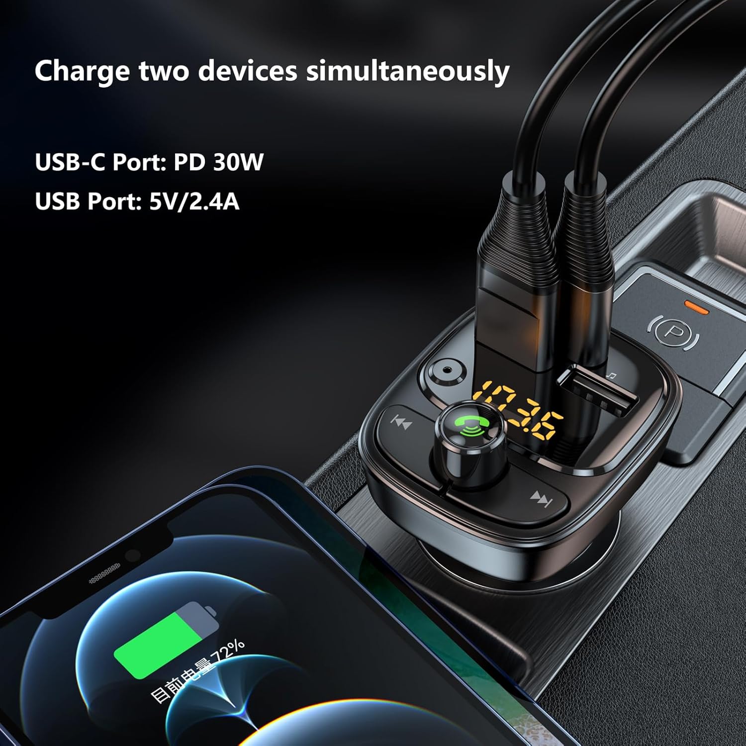 Bluetooth 5.3 FM Transmitter Car Adapter, Wireless Radio MP3 Player Stereo Music Audio Receiver Hands Free Calling, 42W (PD 30W & 12W) USB C Car Charger for iPhone, Support TF Card & USB Disk (Black)