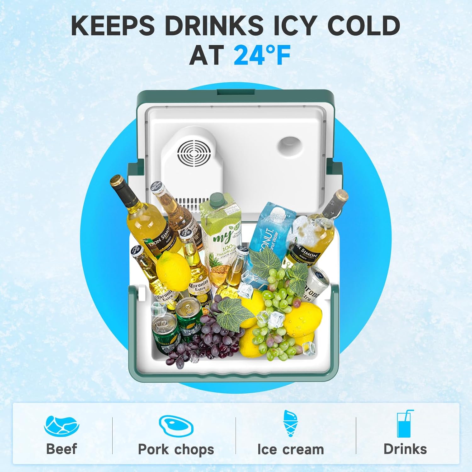 - Keep Cooler and Warmer: Our electric cooler both cooling and heating functions.Maintains the drinks icy cold at 24°F(-4.5 â) or the hot food at 147°F(64 â).Whether you're on a road trip or camping in an RV,this car cooler guaranteed to keep your drinks cold and your food fresh!