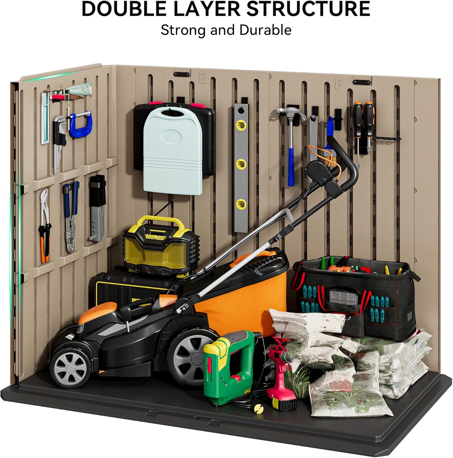 - DOUBLE-WALL PANELS- The outdoor storage shed features dual-wall resin panels that are processed with advanced technology for stronger wind & impact resistance; It won’t easily bend or puncture; Enjoy a secure place to store your valuable tools and equipment
