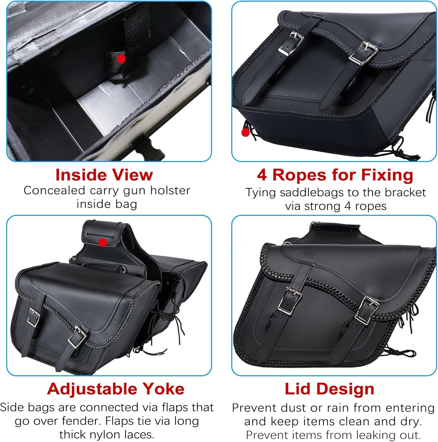- [Easy to Access] - The saddle bags are designed with pin buckles and the quick release snap buckles. The quick-release buckles allow you to easily access the stuffs of the bags. Flap design of saddlebags and quality leather construction help keep rain or dust out and make your stuff dry and clean. The saddlebags feature gunn holsters. Elastic and adjustable strapping in each bag built for concealed carry.