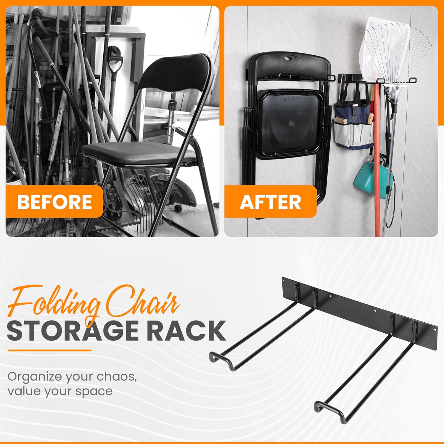 - 【WIDE APPLICATION】 The versatile and alluring wall hook rack is perfect for multiple uses as you can use one rack to hold patio chairs, beech chairs, event chairs, or camping chairs and other rack to hold various tools such as shovels, rakes, power tools, broom, ladders and more. Enjoy the grandiose features of this storage rack and level up your space storage organization.