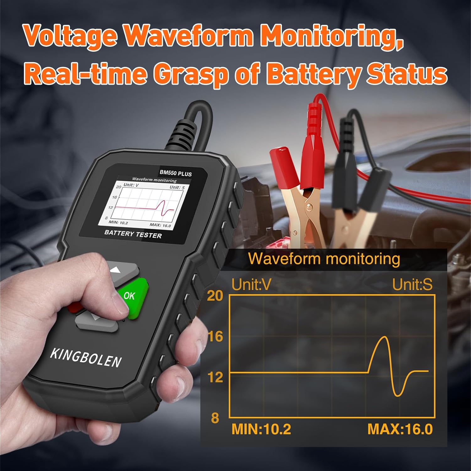 KINGBOLEN BM550 Plus 6V-24V 100-2000 CCA Car Battery Tester, Voltage Waveform Analyzer for Cars Trucks SUV Motorcycle