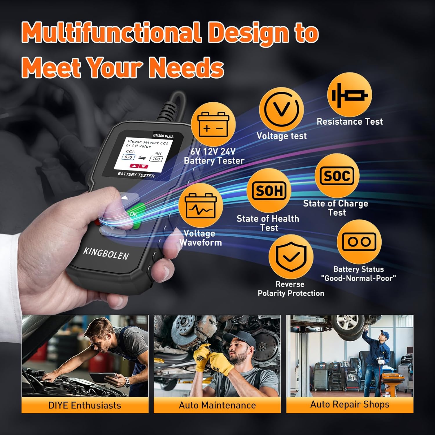 - 【Multifunctional Battery Tester】KINGBOLEN BM550 PLUS car battery analyzer can quickly and accurately display multiple data of the car battery and the results based on the CCA standard. It can test the SOH (state of health) and SOC (state of charge) of the car battery, easily test internal resistance test and 100-2000 CCA voltage test. With our battery tester, you can easily grasp the current state of your car battery and avoid accidents. Nice little tool to have in the toolbox.