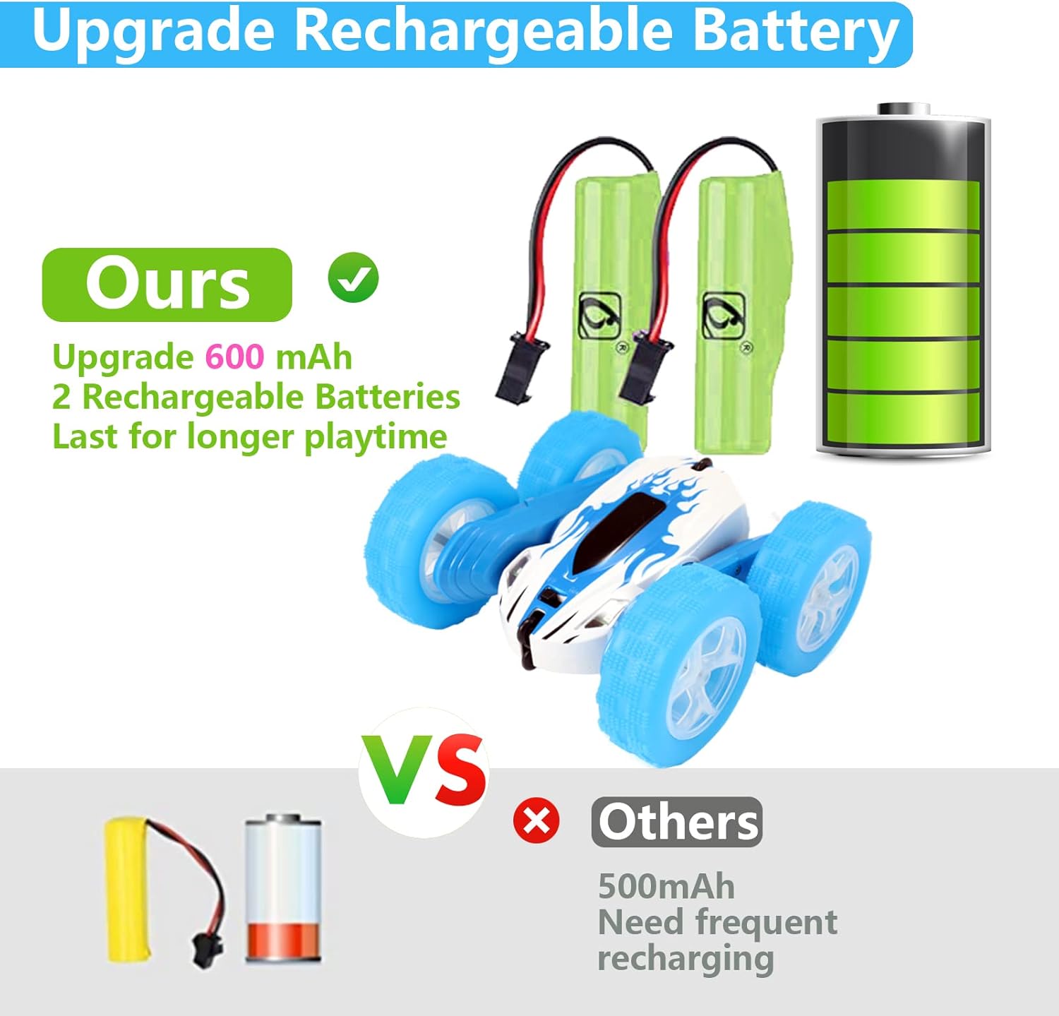 - Battery Life: The RC car comes with two 3.7V 600mAh rechargeable batteries, providing approximately 30 minutes of playtime each. Additionally, two 1.5V AA batteries are included for the RC controller, ensuring the car is ready to run upon receipt.