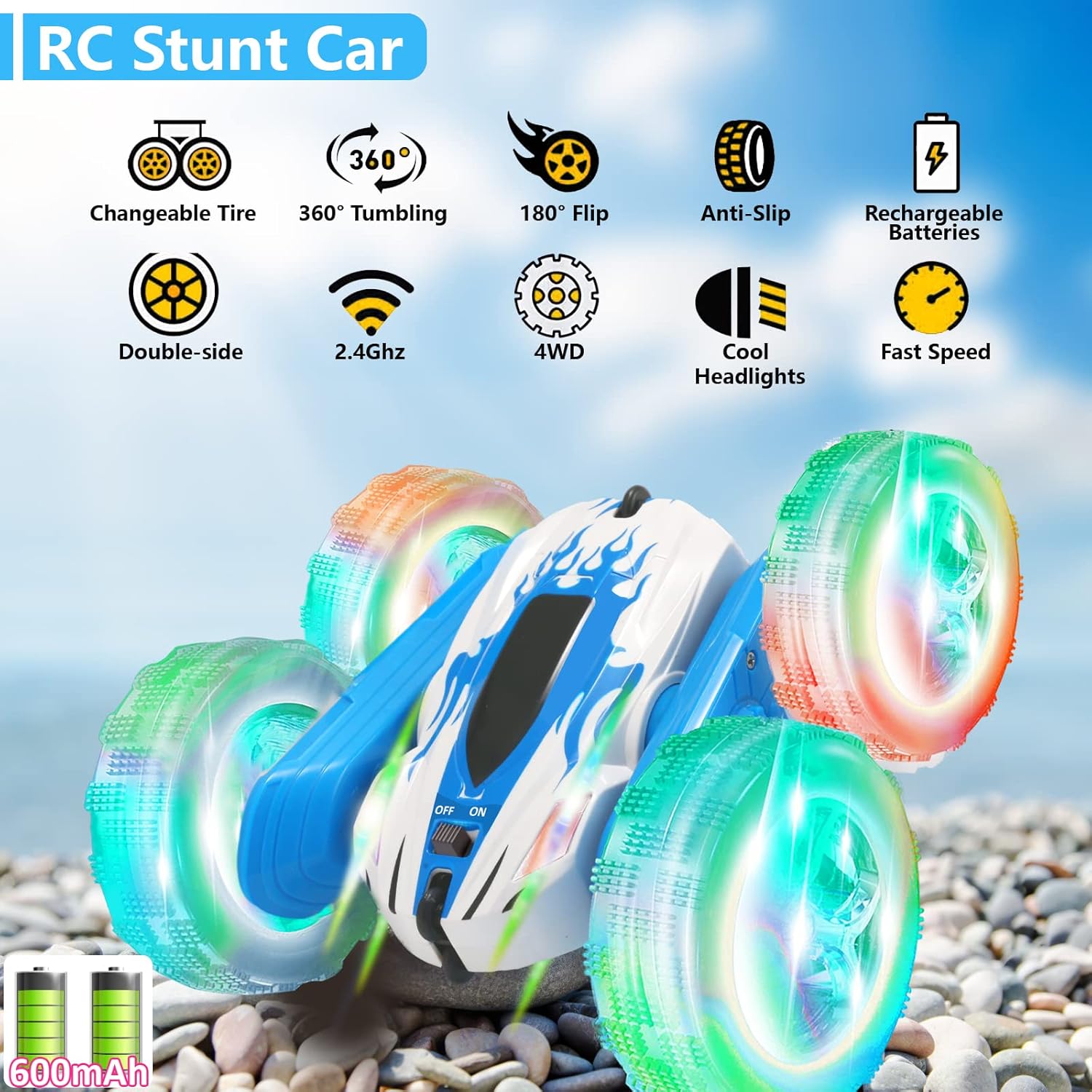 - 360° Rotating Stunts: The RC car can perform a variety of stunts, including running, moving forward and backward, turning right and left, rolling, and rotating 360 degrees. It can also drive on both sides, allowing for different playing experiences and the ability to pass obstacles easily.