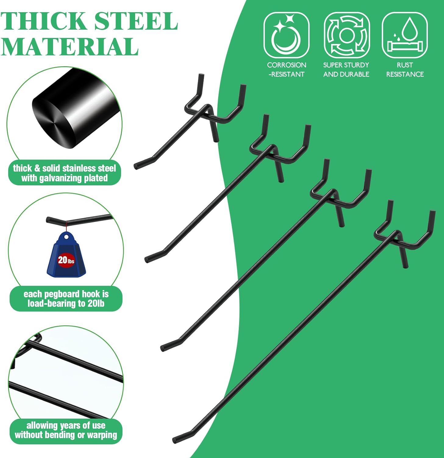 - [Thick Steel & Durable Material] Our pegboard hooks for hanging are made of thick & solid stainless steel with galvanizing plated to provide maximum strength and corrosion & rust resistance. Each pegboard hook is load-bearing to 20lb, allowing years of use without bending or warping.