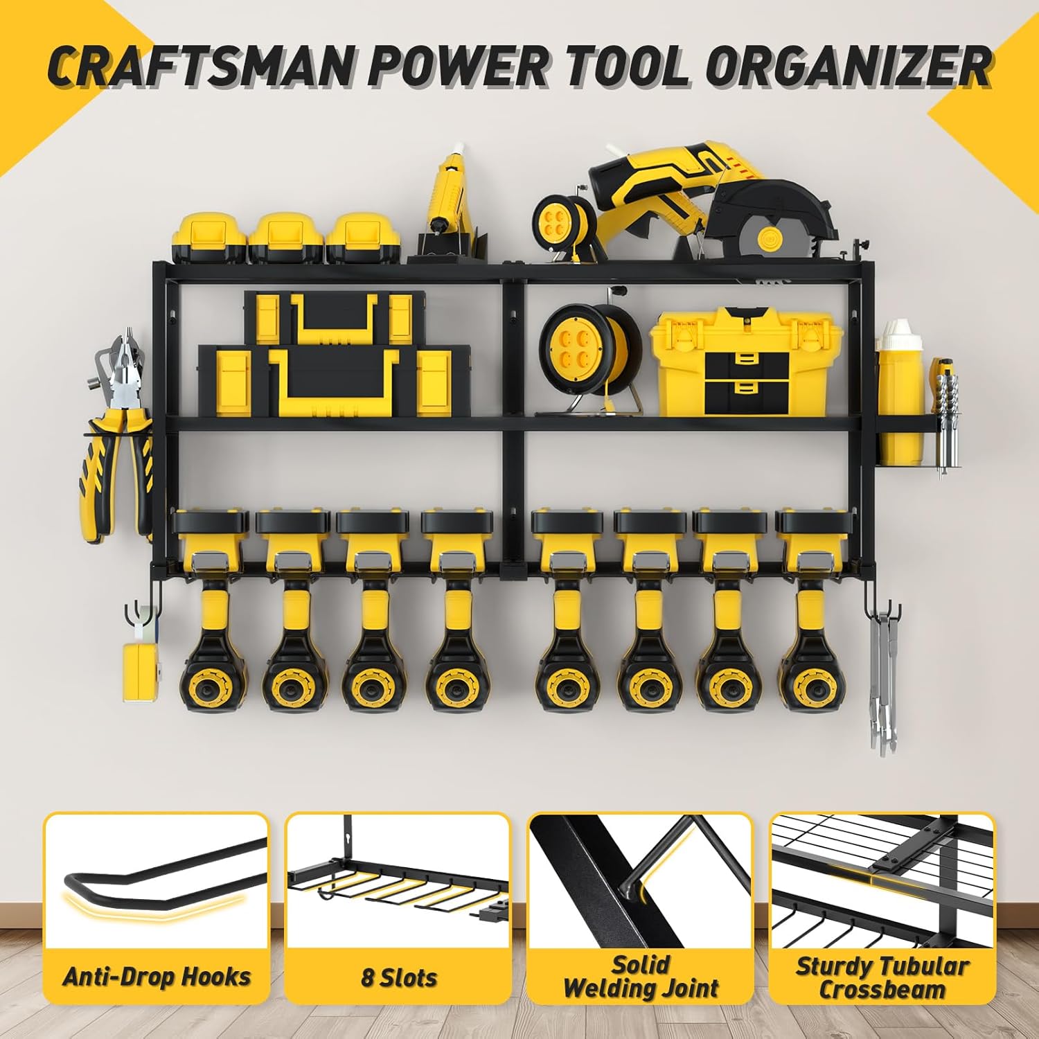 - REINFORCED DURABILITY & HEAVY-DUTY CONSTRUCTION: Built to last, the Mefirt Power Tool Organizer features upgraded welding points and a scratch-resistant, anti-rust coating, ensuring enhanced strength and longevity. Constructed from thickened heavy-duty steel, this rack confidently supports over 300 pounds without bending or breaking. Rigorously tested for strength and stability, it resists deformation and securely stores your heaviest tools, making it the ultimate choice for garages, workshops, or DIY projects.