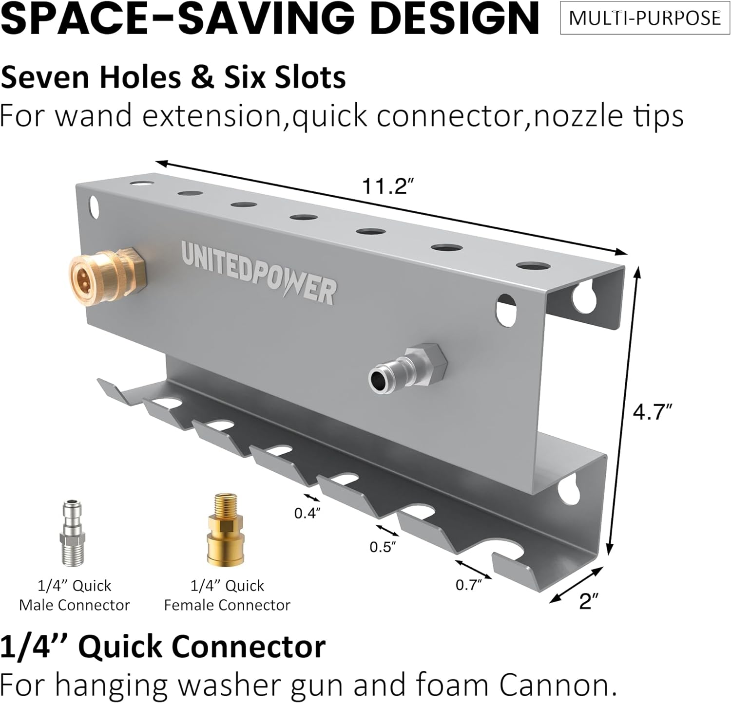 - Simple yet Multipurpose: All in one Pressure Washer Gun Accessories Storage Rack, Come with 1/4 inch quick connect male and female fittings, hold up pressure washer gun, foam cannon, nozzle, and wand extension wand simultaneously, keeps your workspace organized, decluttered and tidy