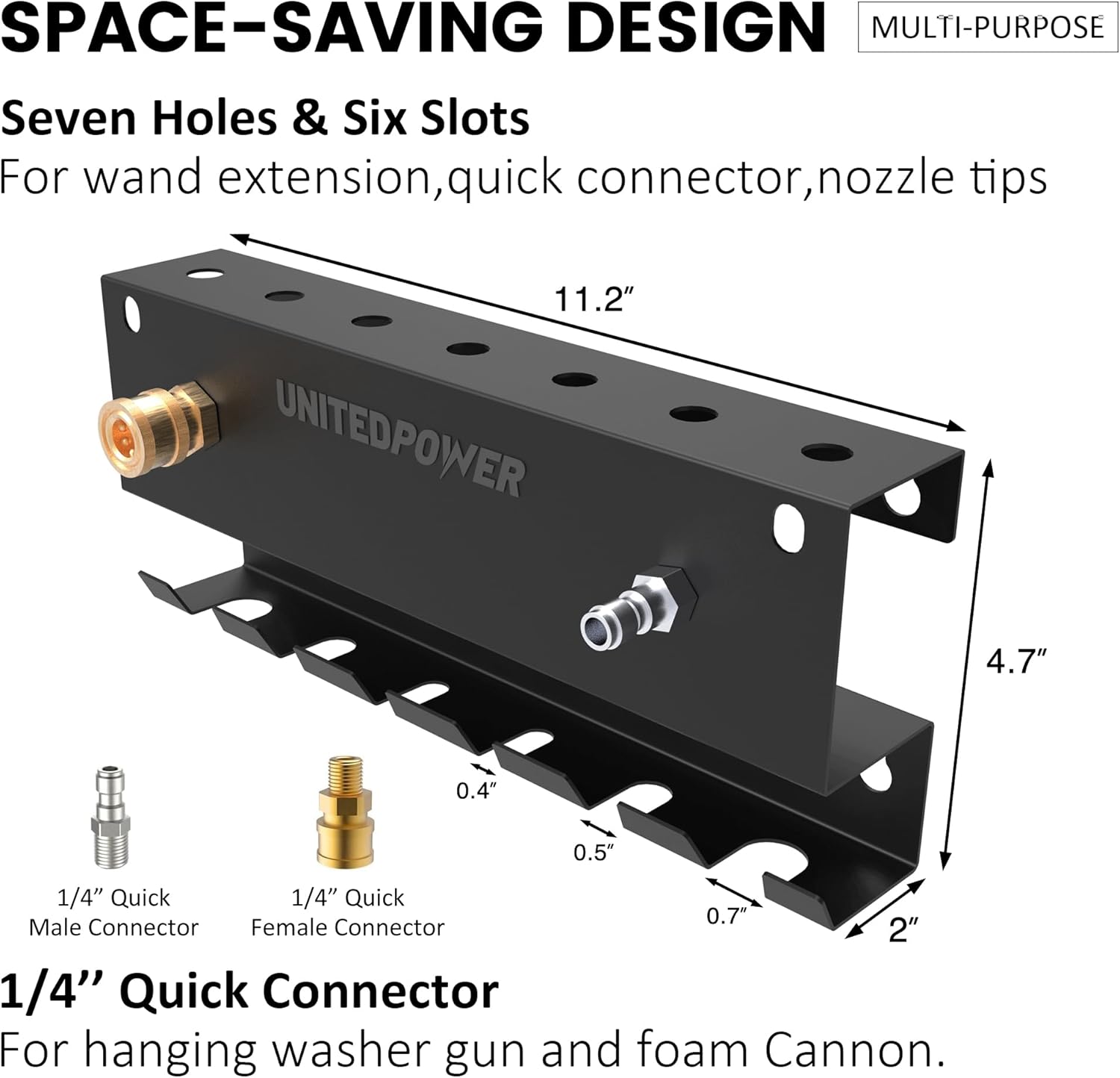- Simple yet Multipurpose: All in one Pressure Washer Gun Accessories Storage Rack, Come with 1/4 inch quick connect male and female fittings, hold up pressure washer gun, foam cannon, nozzle, and wand extension wand simultaneously, keeps your workspace organized, decluttered and tidy