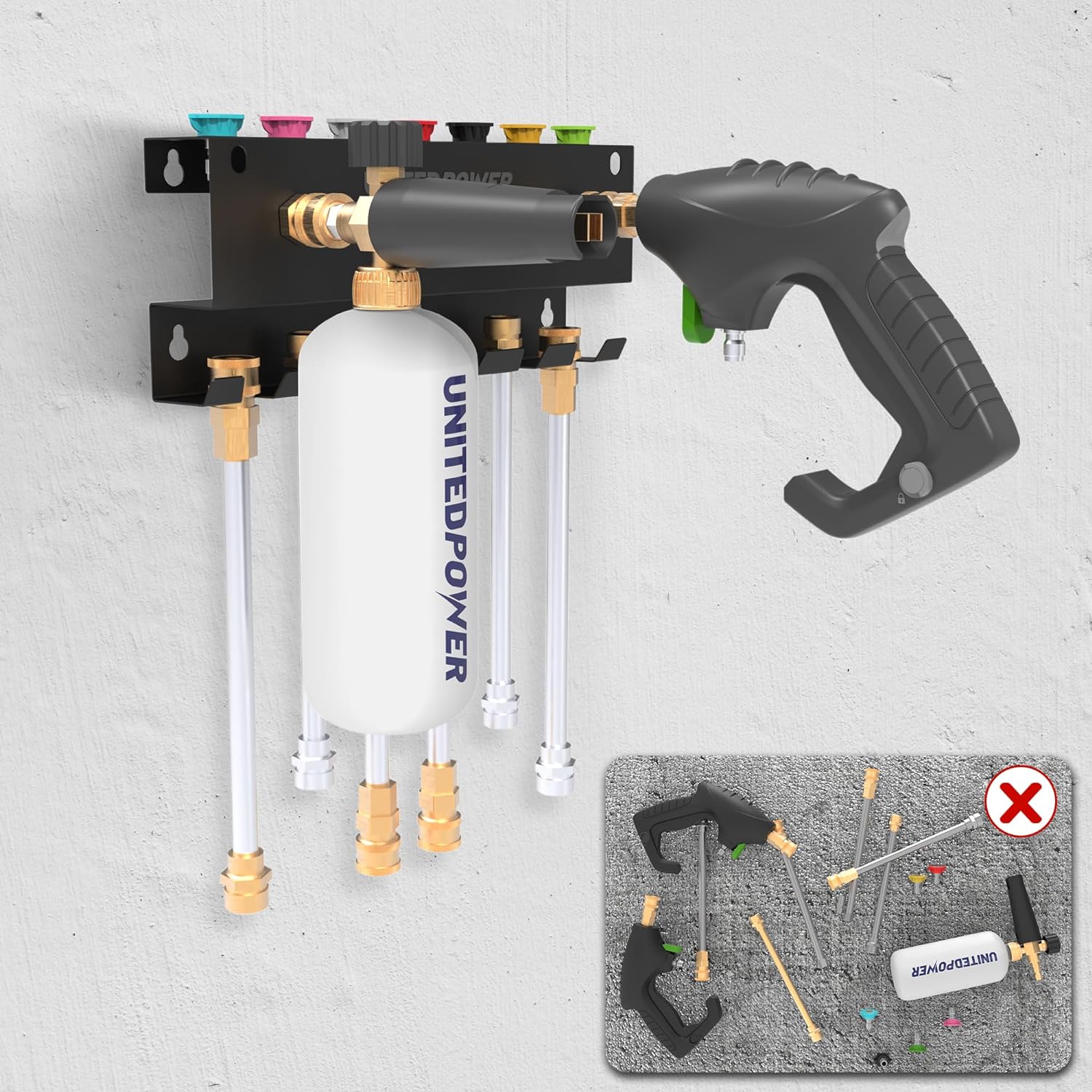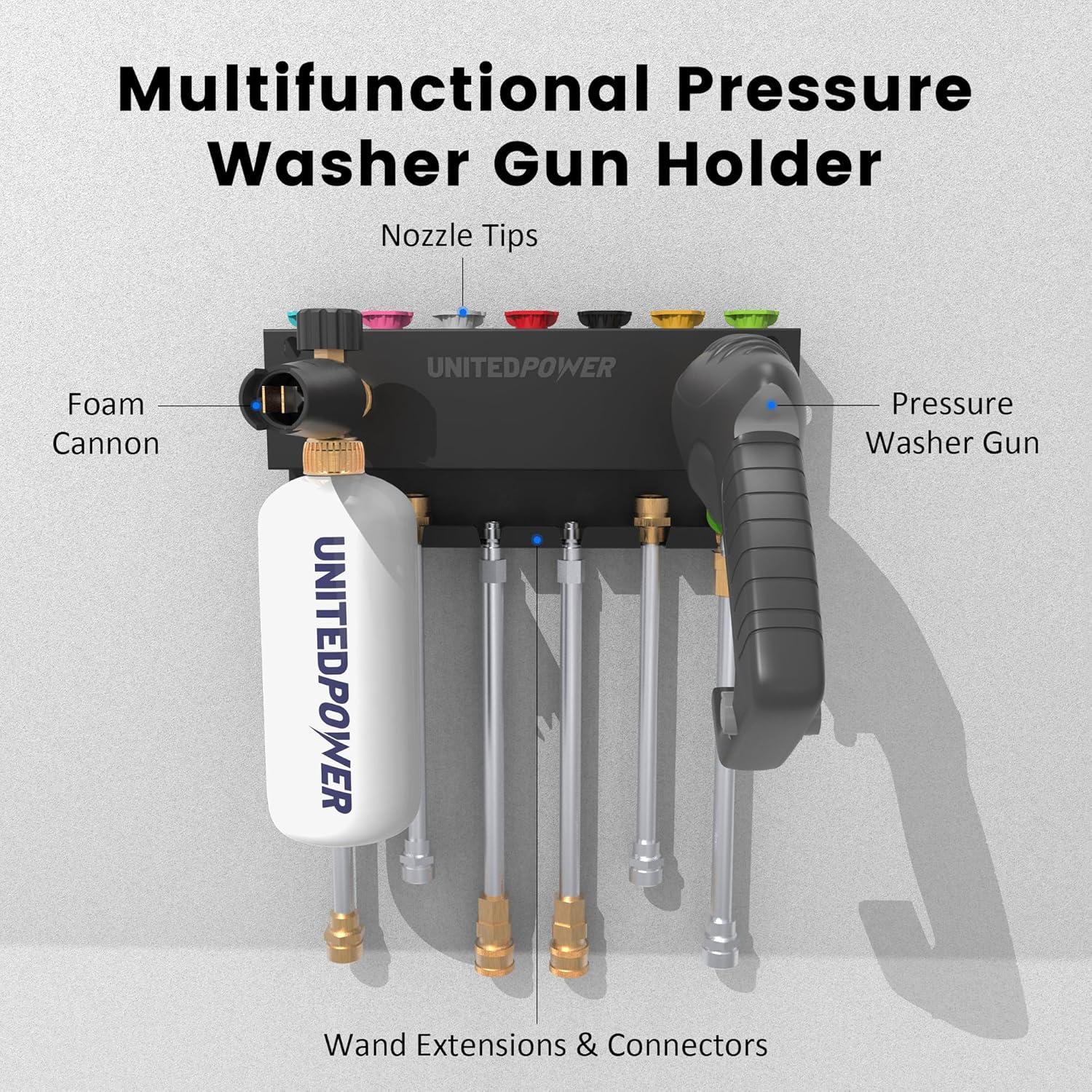 UNITEDPOWER Pressure Washer Gun Holder,Wall Mount Foam Cannon Holder,Tool Storage Rack for Pressure Washer Wand/Nozzle Tips, Car Wash Accessories Organizer, Black