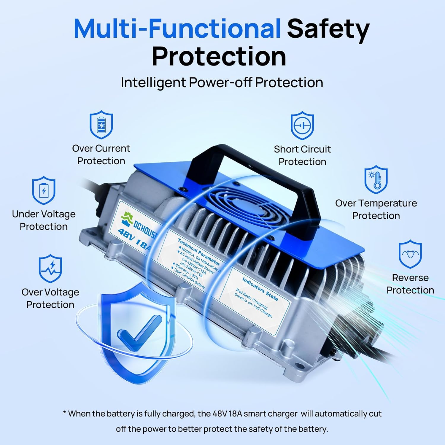 - 6 Safety Protections: 48V lithium battery charger is equipped with BMS protection. With the internal BMS of DC HOUSE lithium batteries, equip dual protection system. Offers input under voltage & over voltage protection to shield battery from abnormal voltage damage.Charger overheat protection to avoid safety risks caused by high temperatures. Output no load protection ensures safety without load, while output short circuit & reverse connection protection prevent damage from wiring issues. Output over current & over voltage protection guarantee a stable charging process. Battery is fully charged, it automatically cuts off. Cooling fan dissipates heat effectively during charging.