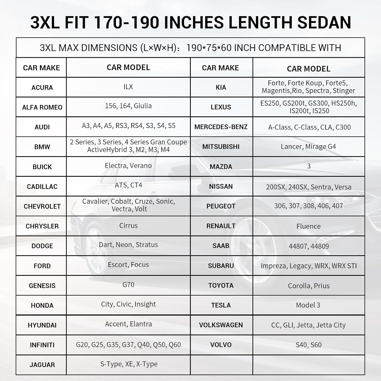 - UNIVERSAL FITMENT - Our 3XL universal car cover is fit for sedan which length is 170 to 190 inches. Compatible with Toyota Corolla, INFINITI Q40/Q50/Q60, Honda Civic, Hyundai Accent/Elantra, Ford EcoSport, BMW 3 Series, Audi A3/A4/A5, Chevrolet Cruze/Sonic, Buick Electra, Kia Forte/Rio, Lexus ES250, Mazda 3, Sentra/Versa, Subaru Legacy/WRX, ILX/Integra, Volkswagen Jetta, etc. The Tecoom weather proof car covers are extensively tested to achieve a custom-like fit for each vehicle