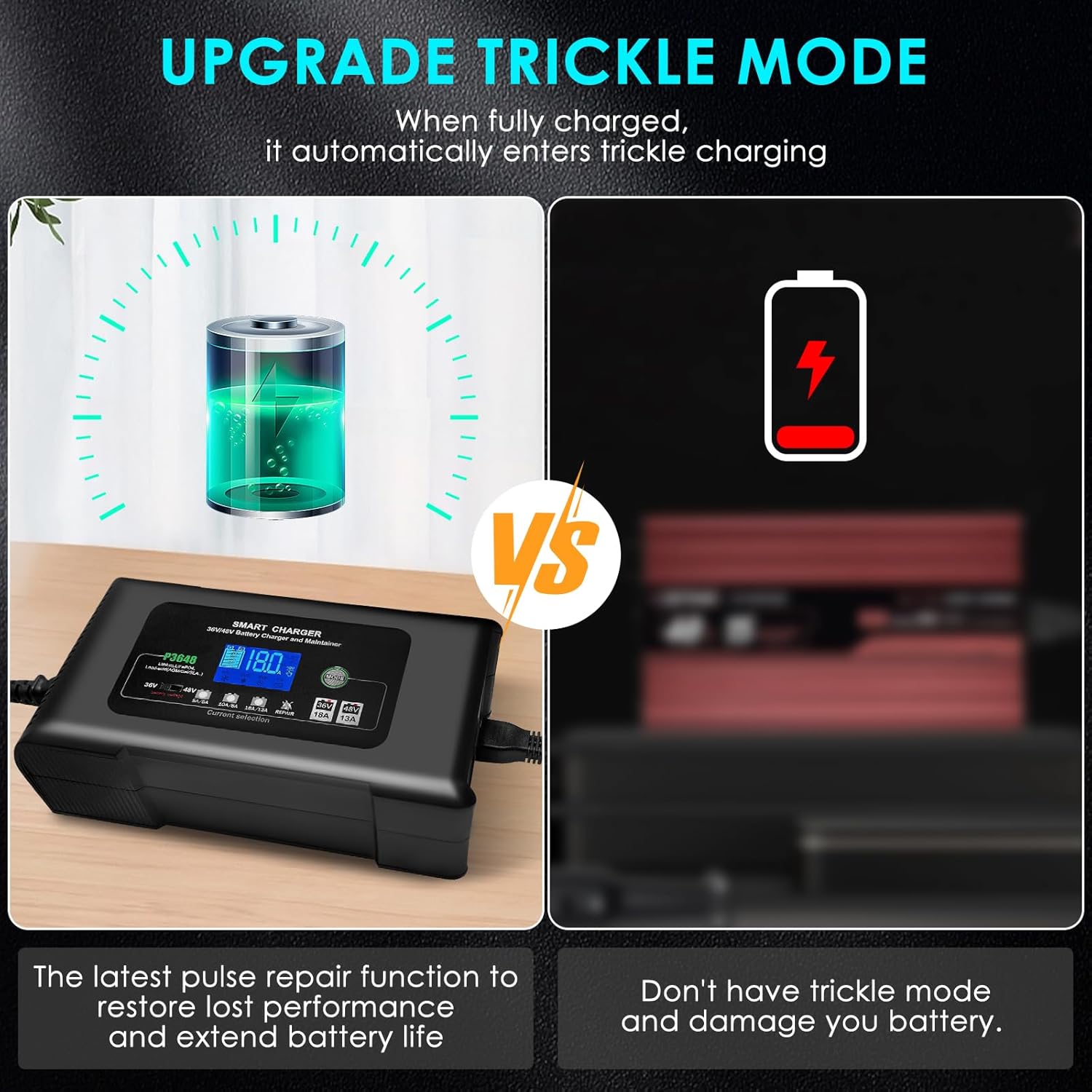 - 【9-STAGE SMART TRICKLE CHARGER] : Protection and Maintainer.Plug and play 9-stage smart charging technology, when fully charged, it automatically enters into trickle charging, detects sulfate layer and acidic layer, and adopts the latest pulse repair function to restore the lost performance and prolong the battery life. Input Voltage: 100-240V 50/60Hz, Maximum Output Voltage/Current: 36V 18A, 48V 13A. Minimum Starting Voltage: 26V. NOTE: It can not activate a depleted battery.