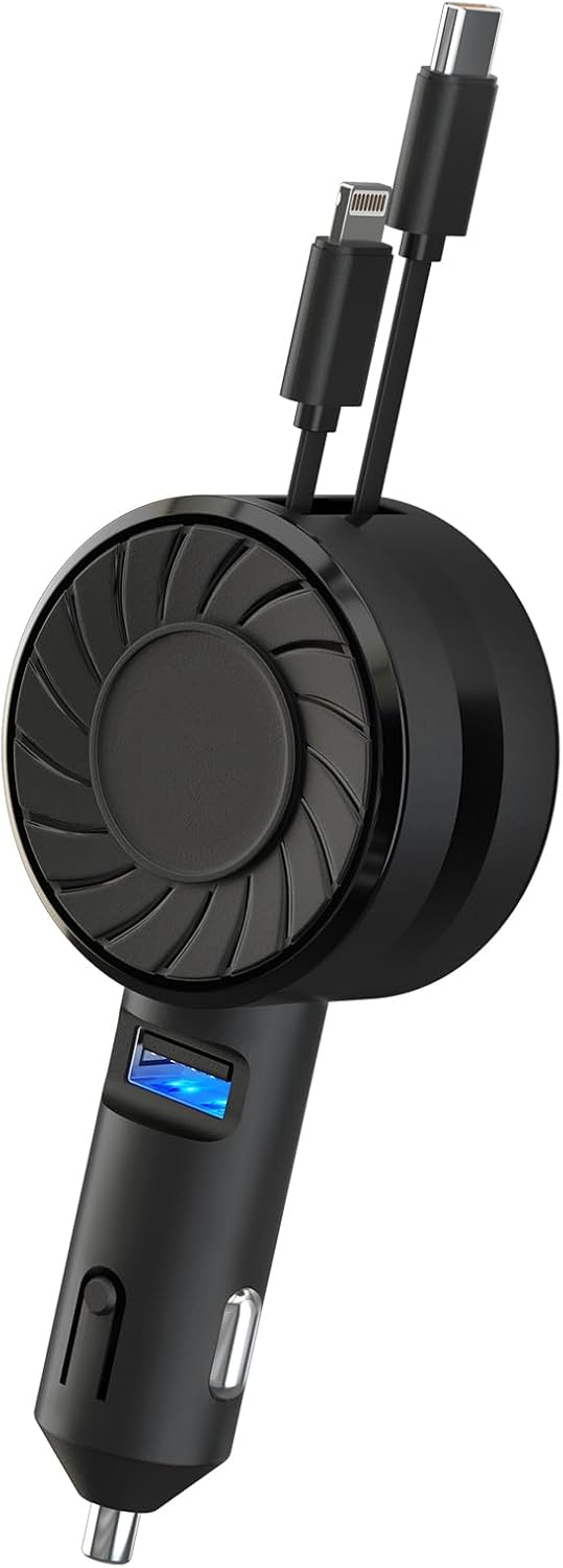 - Retractable Charging Cord : 2 pieces retractable cords(one is lighting cable and another is USB-C cable) support more convenience for charging in the car. The long cable allows you charge the device in any seats meanwhile use the phone free. The cable retracts smoothly and automatically, it offers effortless storage. When in use, simply pull out the cable until you hear a “click” for secure fixing, making charging a breeze. When not in use, a gentle tug retracts the cable automatically, keeping space neat and tidy.