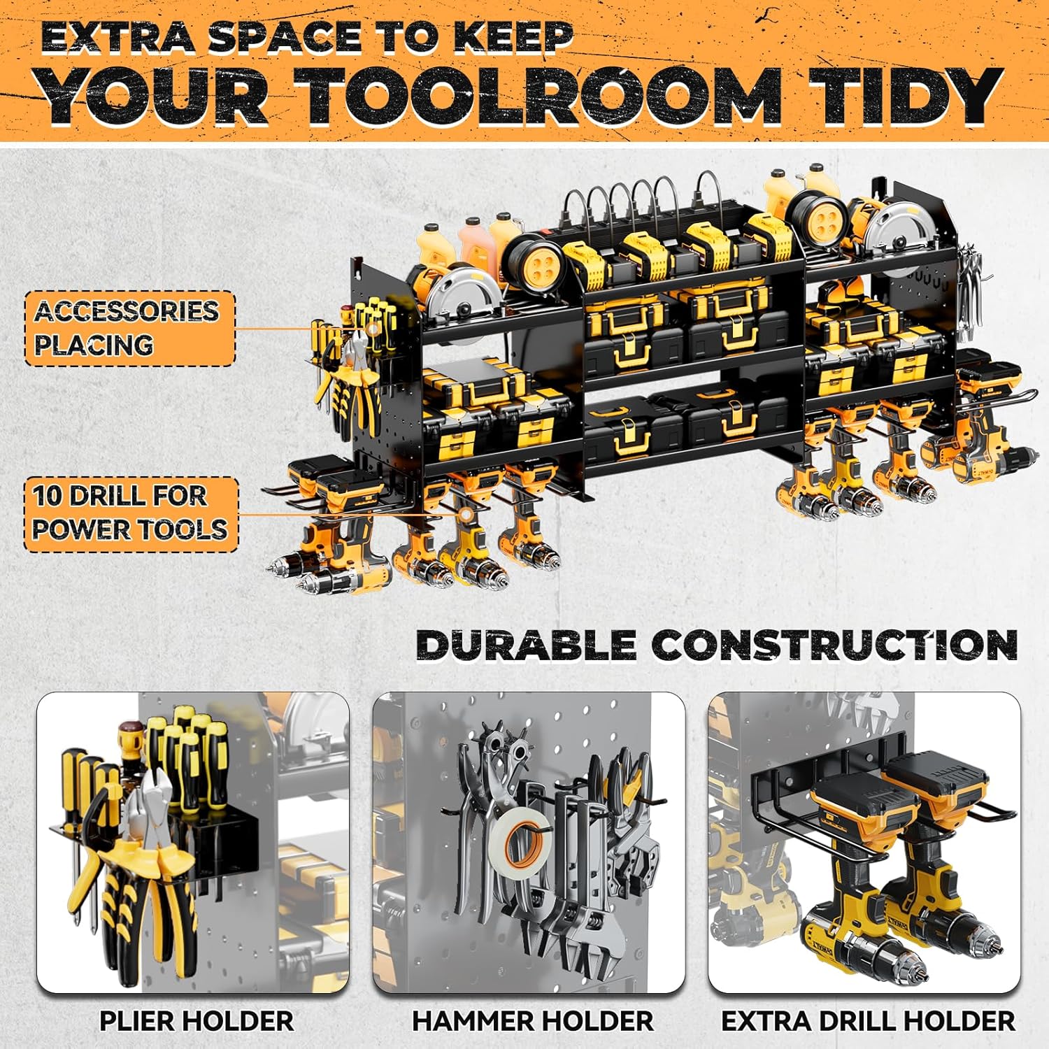- [Perfect Garage Companion]Utilizing wall-mounted installation, this power tool rack maximizes unused wall space, saving time in tool retrieval. Ideal for garages, homes, workshops, sheds, backyard shops, and more, it offers suspended tool organization and storage.