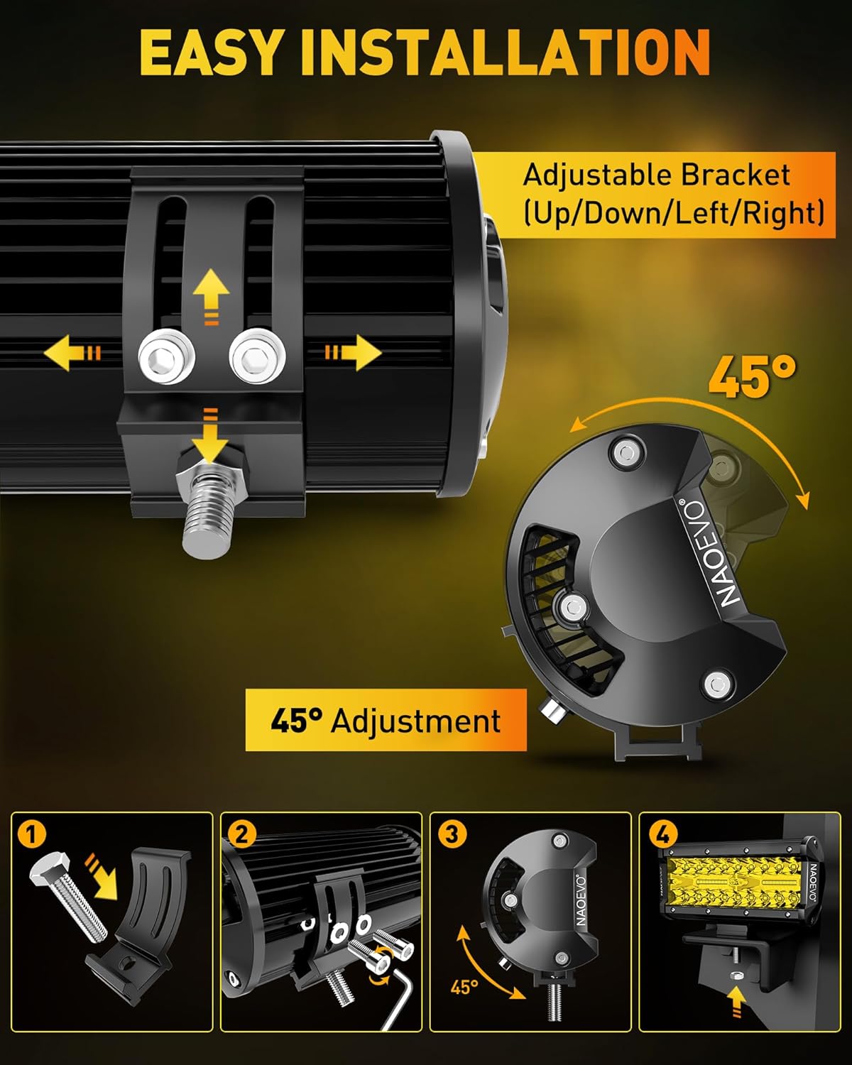 - [Super Bright Off Road Lights] - The 7-inch led bar provides 240W, 24000LM and 3000K yellow light, which has strong penetrability, especially perfect as fog lights or off road lights in rainy/foggy conditions. The 45° adjustable irradiation bracket makes changing direction of light beam easier. Effectively ensure your safety and realize fast cross-country at night.