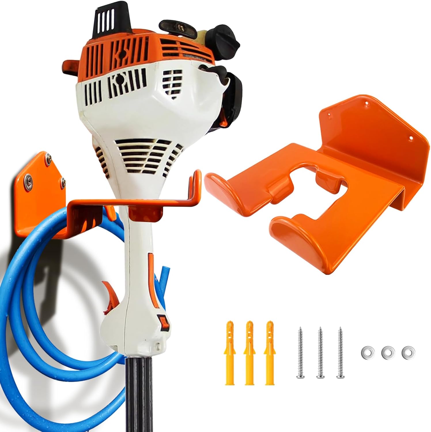 - Package Included: The trimmer rack hook kit come with 2 racks, 6 screws, 6 expansion tubes and 6 gaskets. Ensure trimmer wall hanger has more firm and stable. Garage rack suitable for storing tools in garages storage,chainsaw storage,gardens, tool rooms, and other places.