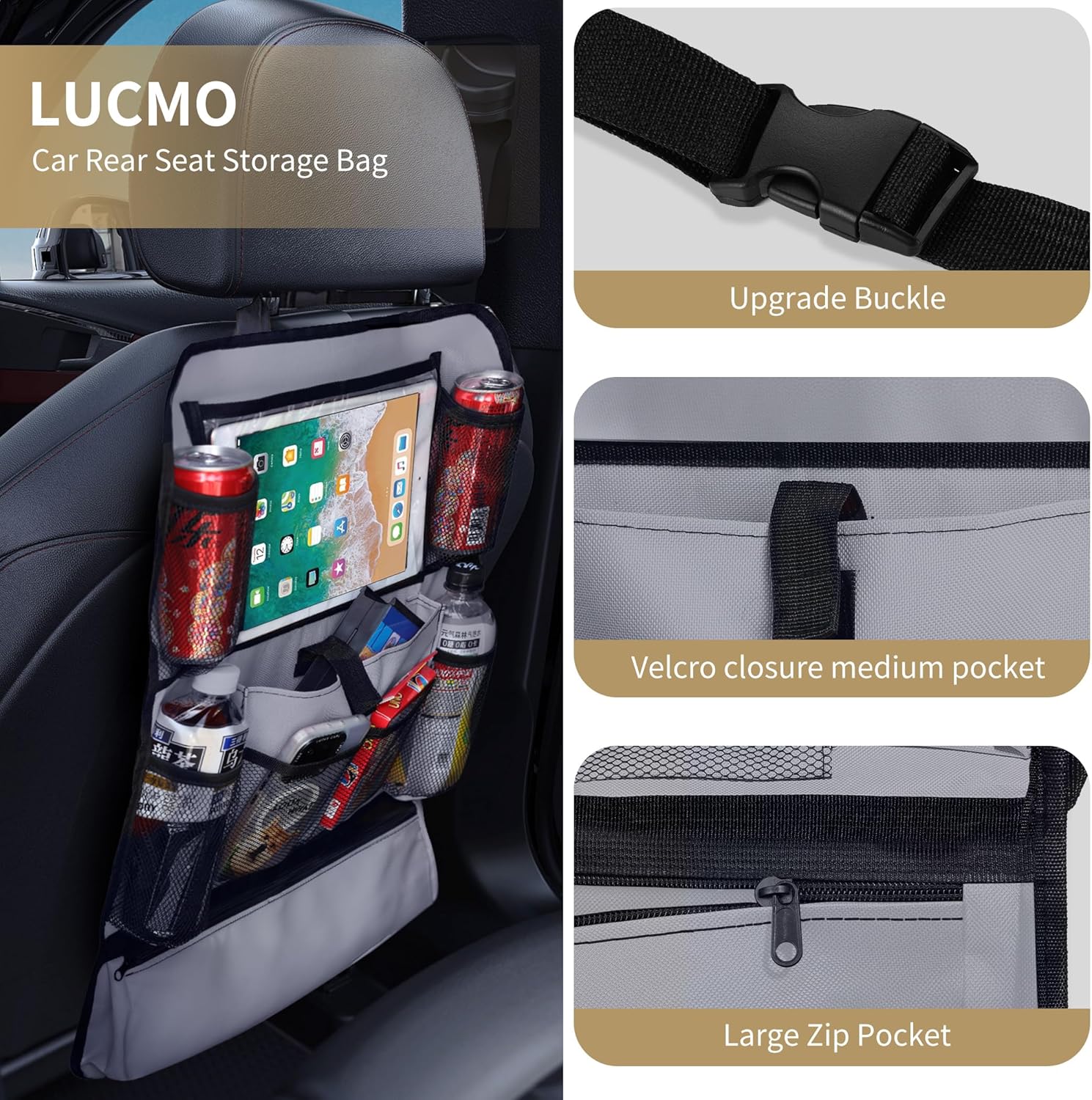 - ăMulti Storage PocketsăLUCMO seatback car organizer comes with 9 storage compartments of different sizes, including a clear tablet holder, bottle pockets, and large mesh pockets for other essentials.
