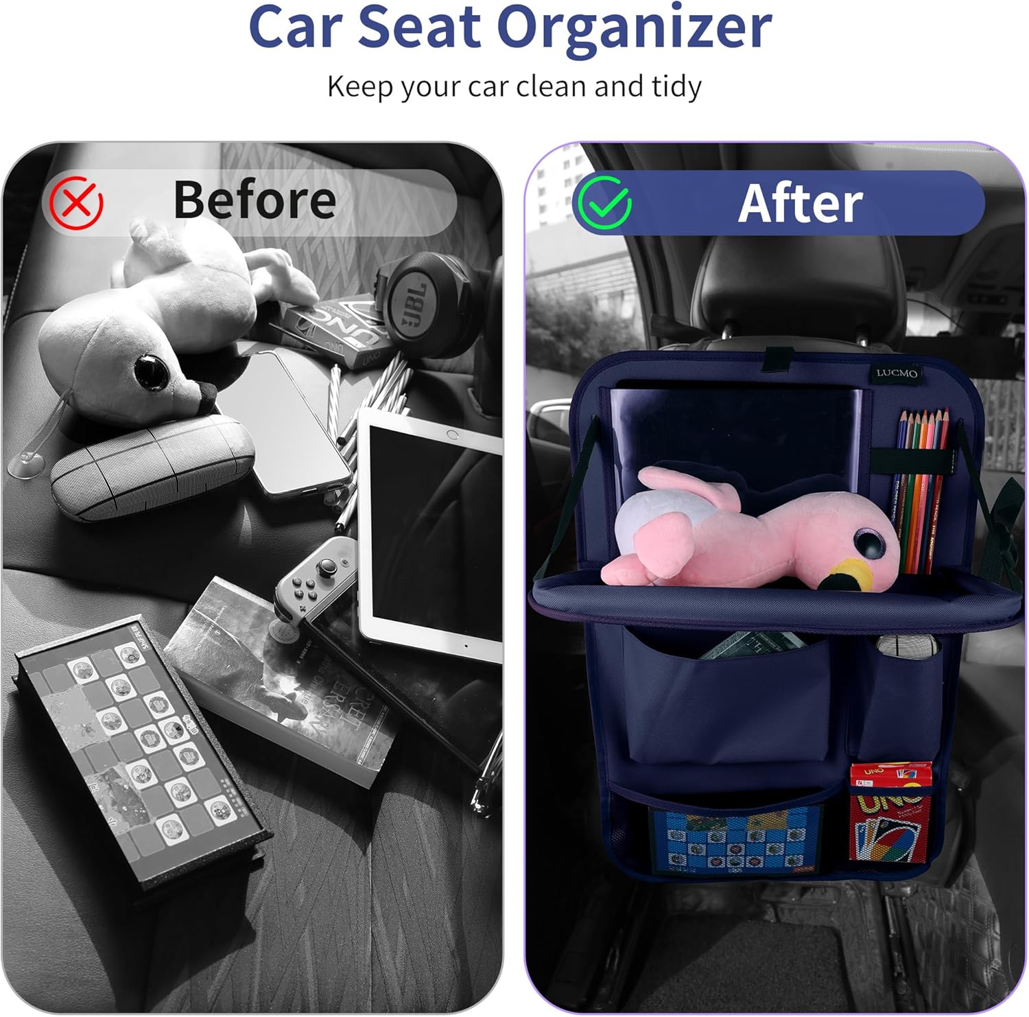 LUCMO Car Backseat Organizer with Tablet Holder,6 Storage Pockets Car Storage Organizer with Foldable Food Tray,Seat Protectors Kick Mats Travel Accessories-Dark Blue