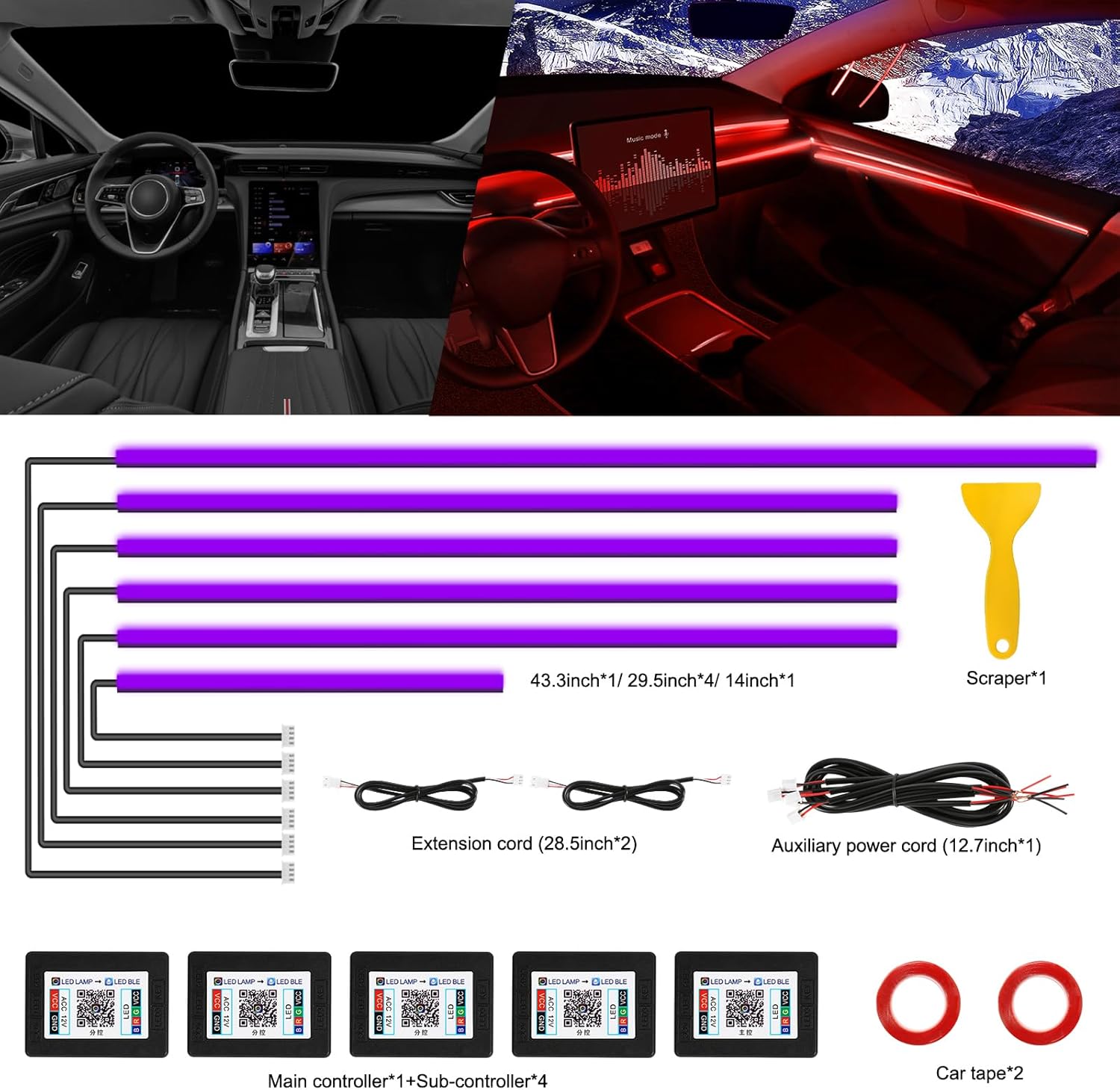 - Included Components : 6 in 1 Acrylic car light kit(4*29.5inch+1*43.3inch+1*14inch), Control box* 5, Pry tool*1+2*Adhesive tape, extension cord * 2 6 in 1 Acrylic car light kit(4*29.5inch+1*43.3inch+1*14inch), Control box* 5, Pry tool*1+2*Adhesive tape, extension cord * 2