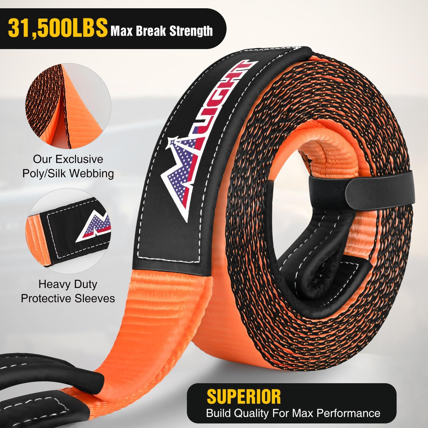- 【Strong Load-bearing Capacity】- After testing, the breaking strength of our Recovery Tow Straps is 31,500LBS, and the normal working load capacity is 10, 633LBS, which meets your daily.