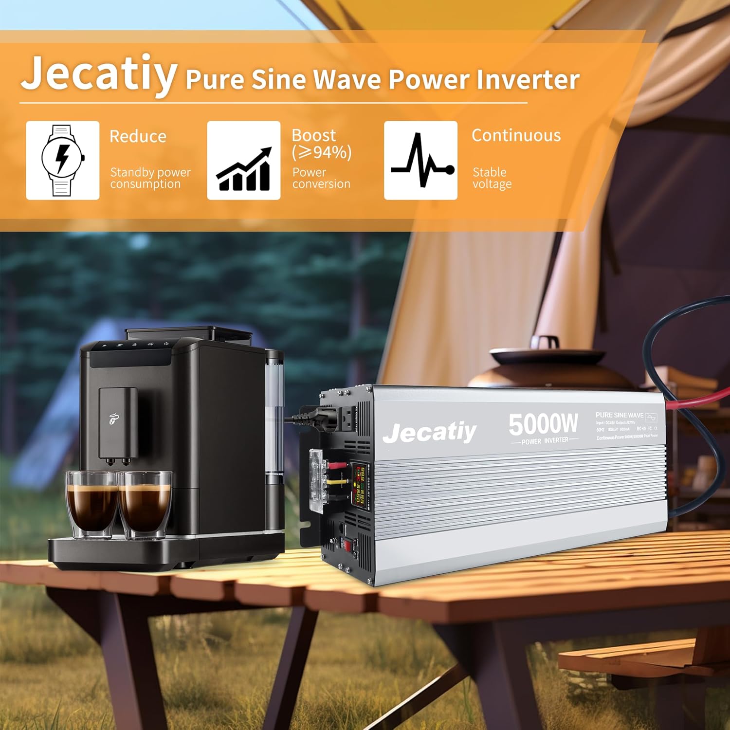 - ăHigh Conversion EfficiencyăAdvanced pure sine technology with high-quality AC equal to mains power, which is the same power used by household appliances, has up to 94% conversion efficiency, and greatly reduces conversion consumption. The Jecatiy power inverter is efficient and safe