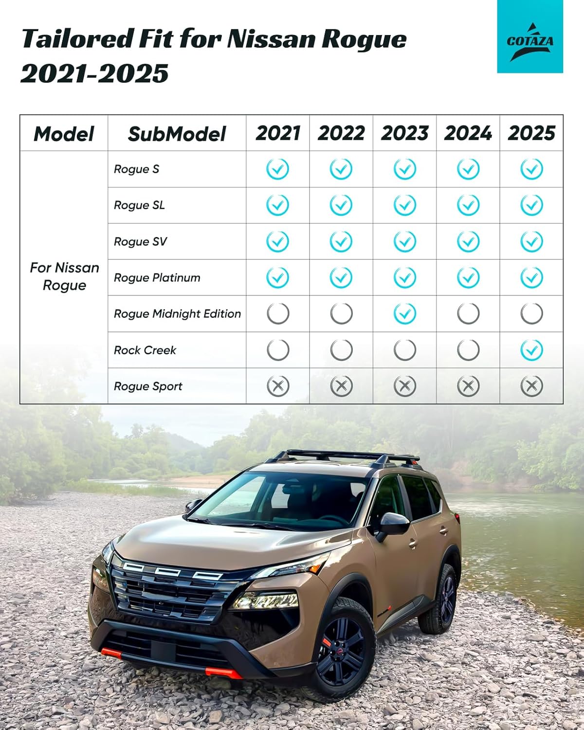 - Custom Floor Mats Full Set : COTAZA uses laser scanning to precisely cut floor mats for Nissan Rogue 2021-2025(Not for Rogue Sport Model). Beyond standard set, we've included cargo mats for back of SUV. They offer full coverage when you fold down seats or carry large cargo, ensuring your whole interior stays uniformly stylish with a complete COZATA car rugs set
