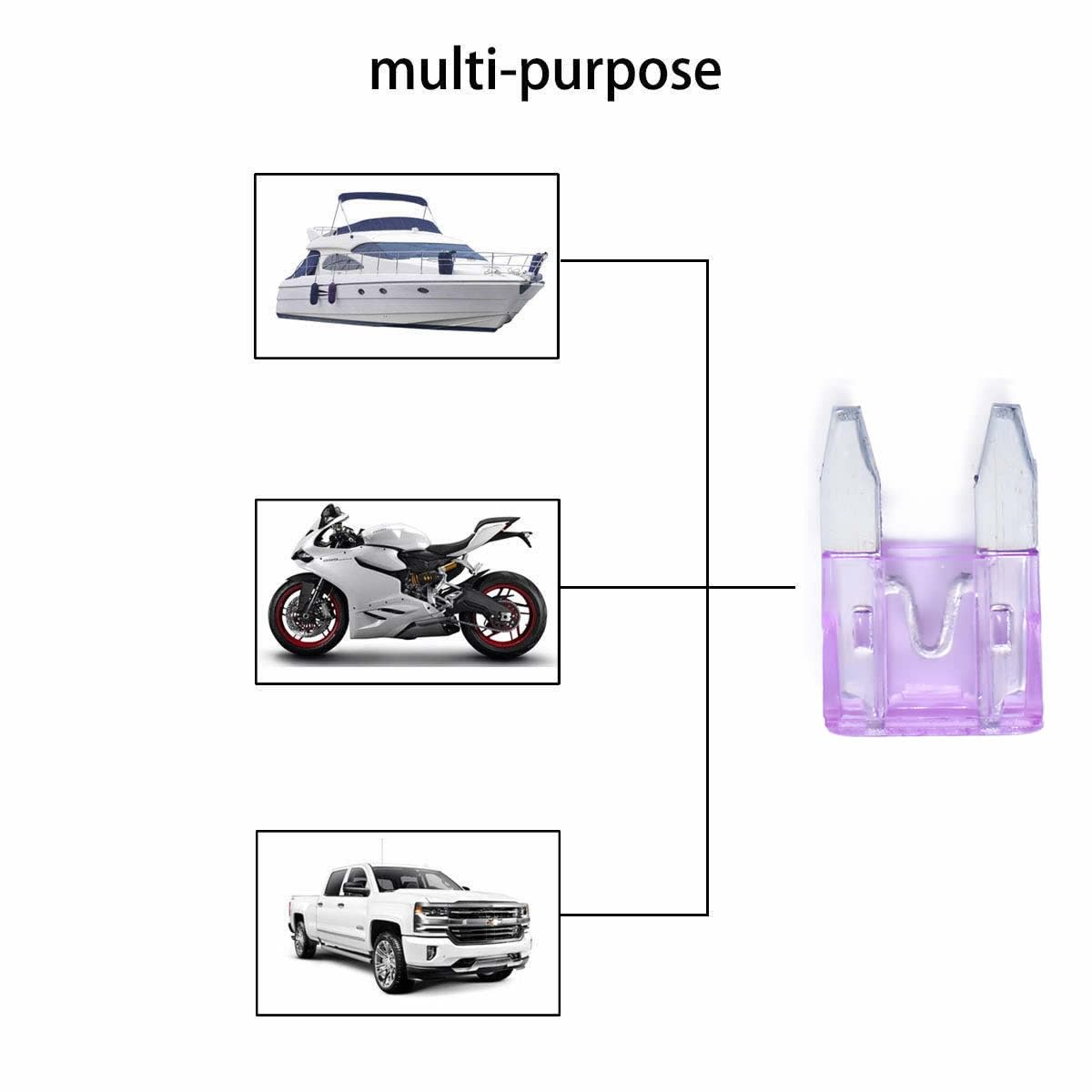 - WIDELY USE - These assorted fuses are specifically designed for Cars, Trucks, SUVs, ATVs, UTVs, Camper RV, Motorcycles, Fleet, Golf Car, Boat, snowmobiles, and most general DC applications etc., covering such components as radio, light, turn signals, etc.
