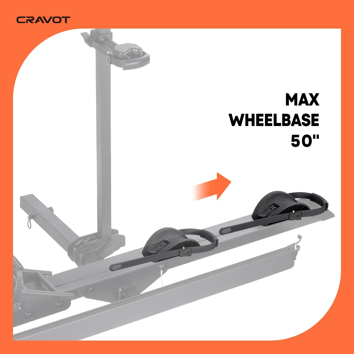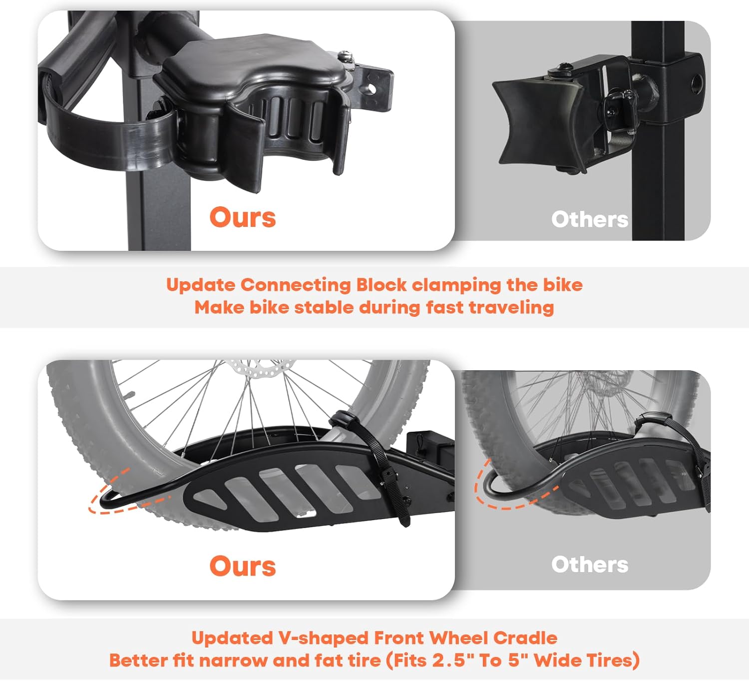 - Enhanced Compatibility & Stability: Our updated 2-inch rack now includes a V-shaped front wheel cradle, accommodating a variety of tire sizes. The vertical rod's connecting block features a semi-enclosed design. With its sturdy bolt system and shock-absorbing threads, this hitch rack ensures unparalleled stability on any terrain. Refer to our easy-to-follow manual or download the E-manual for installation.