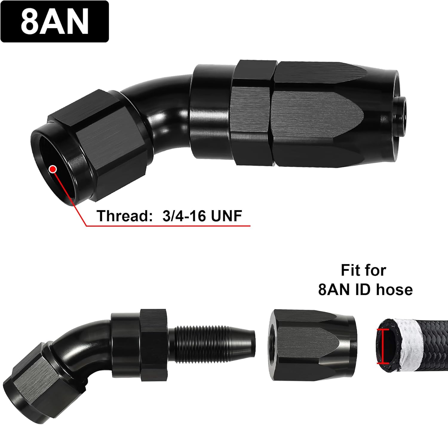 - Size: The thread size of 8AN is 3/4-16UNF. The AN side is sealed by a 37 degree angle