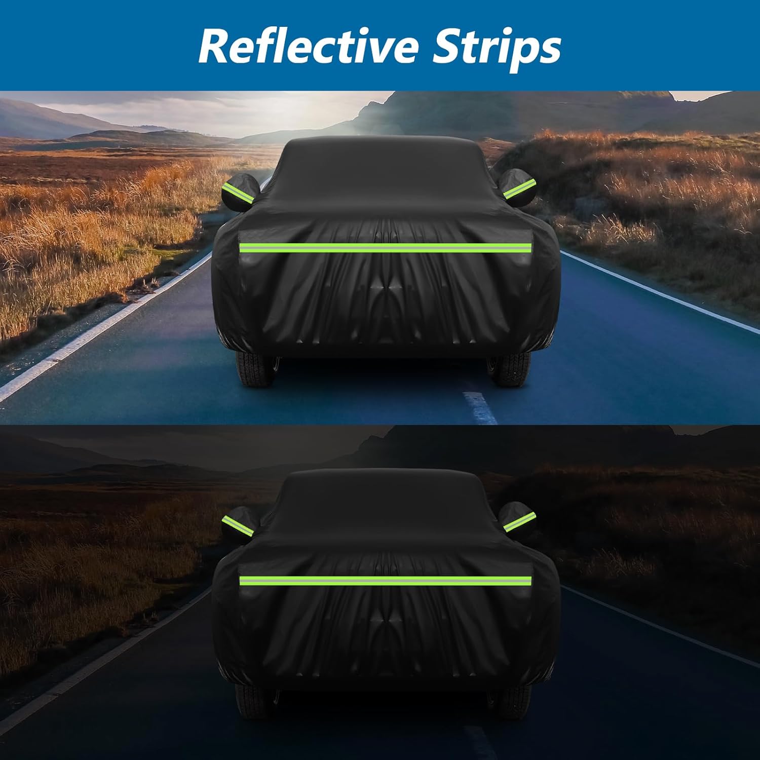 - ăReflective Strips and Driver-Side Zipper Designsă(1) Black Coating: UV protection and heat-proof, prevent cracking and aging of inner decoration leather and plastic. (2)5 Reflective Strips attached on the front DRL lamps, middle Turning lights, and Rear taillight to prevent collisions during the night. (3)It has four straps, a windproof buckle, and a storage bag. (4)Mirror Pocket: protect the rearview mirror in all directions. (5) A zipper on the cab side for convenience.