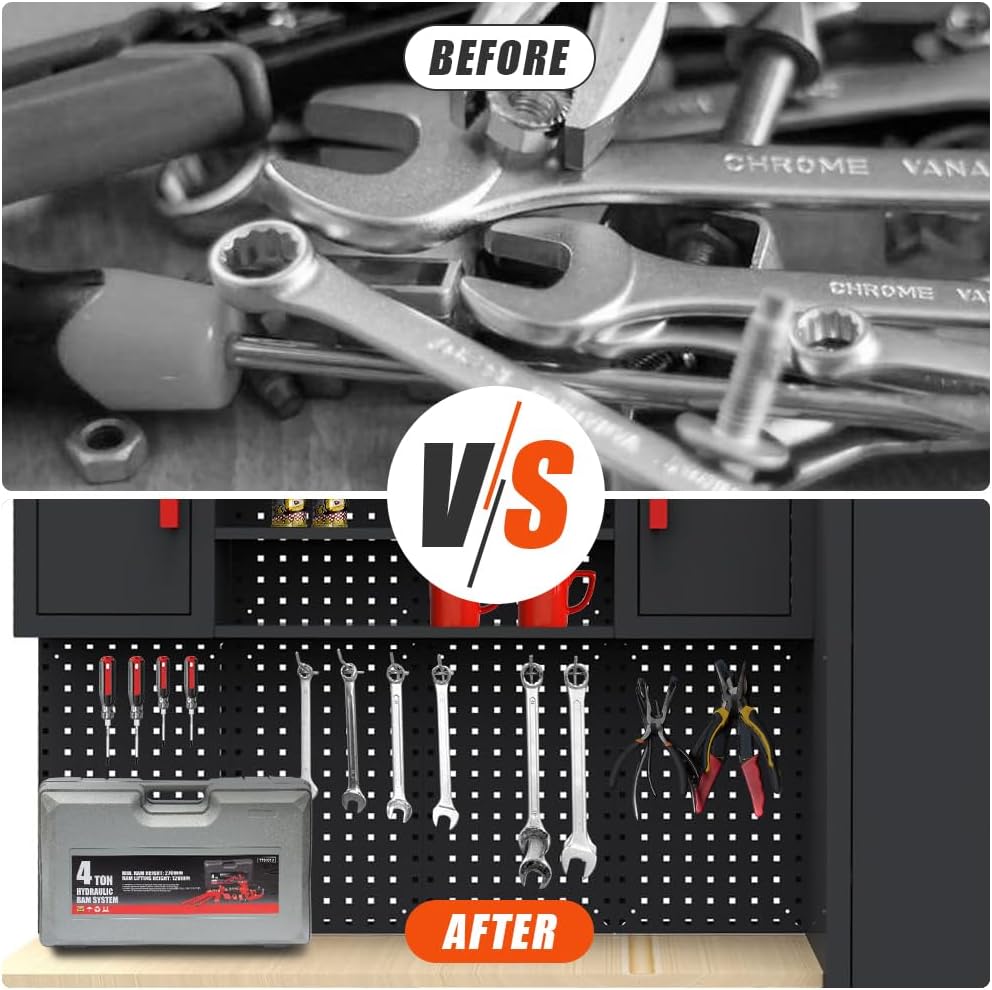 - Practical Pegboard - The pegboard features excellent versatility, making it suitable for use in garages, sheds, workshops, and other spaces where utility tools are kept. By utilizing the pegboard, you can neatly arrange and store your tools, ensuring easy access and efficient organization. For efficiently organizing your small objects on the included pegboard. Metal pegboard is more than 10 times stronger than conventional pegboard. Fit all standard 1/4'' & 1/8'' pegboard hooks, bins, and accessories. Perfect for organizing your garage, and shed workshops