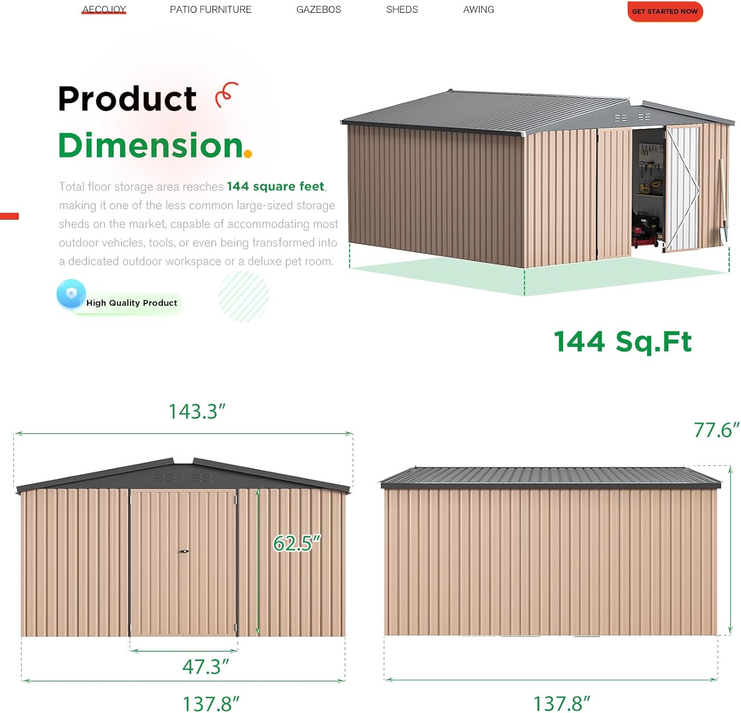 - Ample Storage Space: Boasting a total floor storage area of 144 Sq.Ft, our storage shed is among the larger options available, capable of accommodating a variety of outdoor vehicles, tools, or even serving as a dedicated outdoor workspace or deluxe pet room.