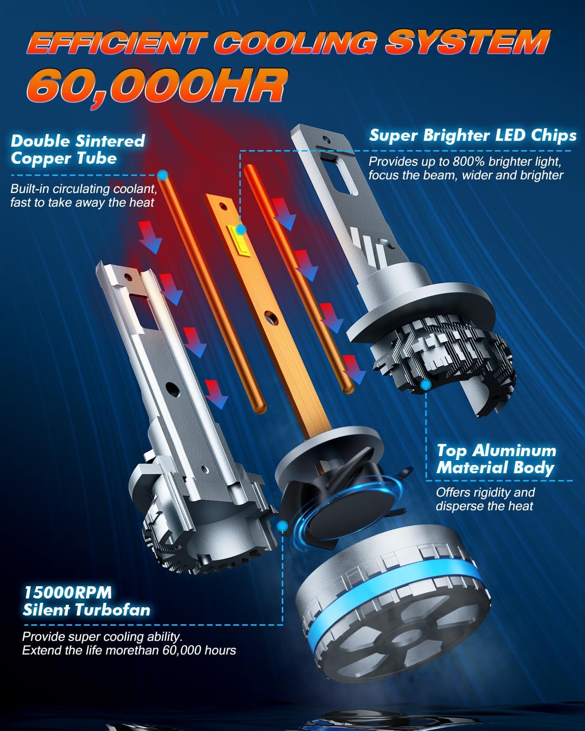 - Durable 60,000+ Hour Lifespan: Built with aerospace-grade aluminum and equipped with a high-speed 15,000 RPM turbo cooling fan, these bulbs are made to last. With over 60,000 hours of continuous light, they minimize the need for replacements, offering long-lasting reliability.