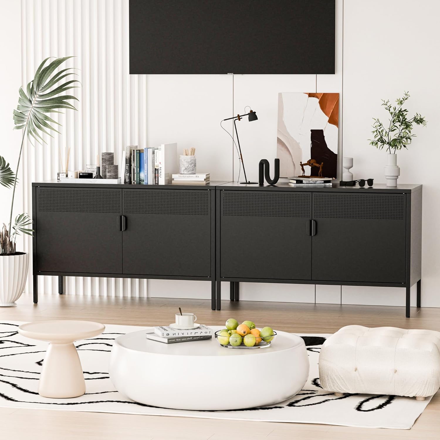 2 Door Storage Sideboard, Metal Storage Cabinet with 2 Adjustable Shelf,Multipurpose Metal Accent Cabinet for Office Home,Music Studio (Black, 25''H)