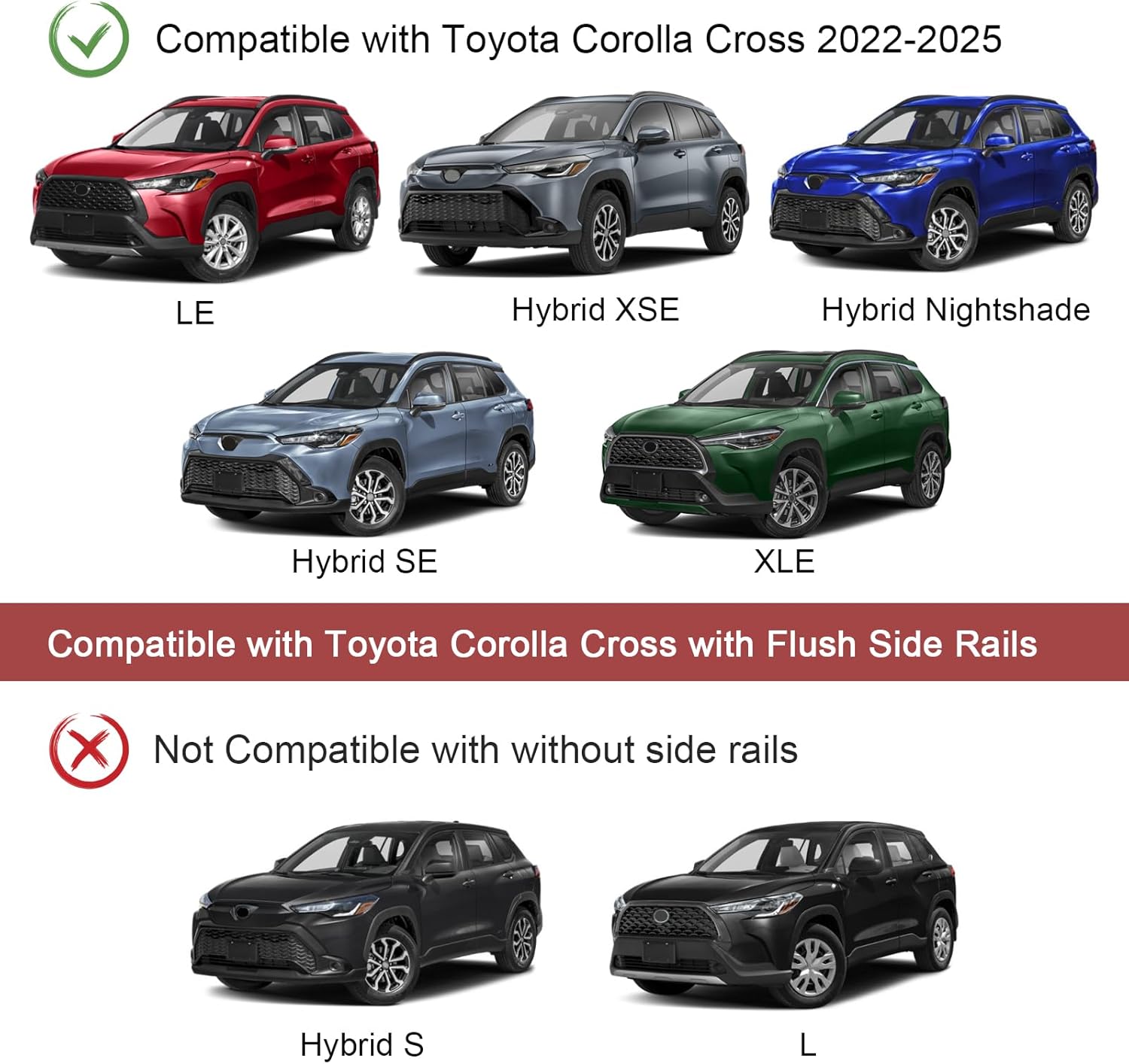 - ăExcellent fităThese roof rack crossbars are specifically replacements for Toyota Corolla Cross 2022 2023 2024 2025 LE XLE & Corolla Cross Hybrid SE XSE Nightshade (WITH FLUSH SIDE ROOF RAILS). Note: Not for L/Hybrid S. Please make sure it fits your vehicle before purchasing. (Not Block the Sunroof).