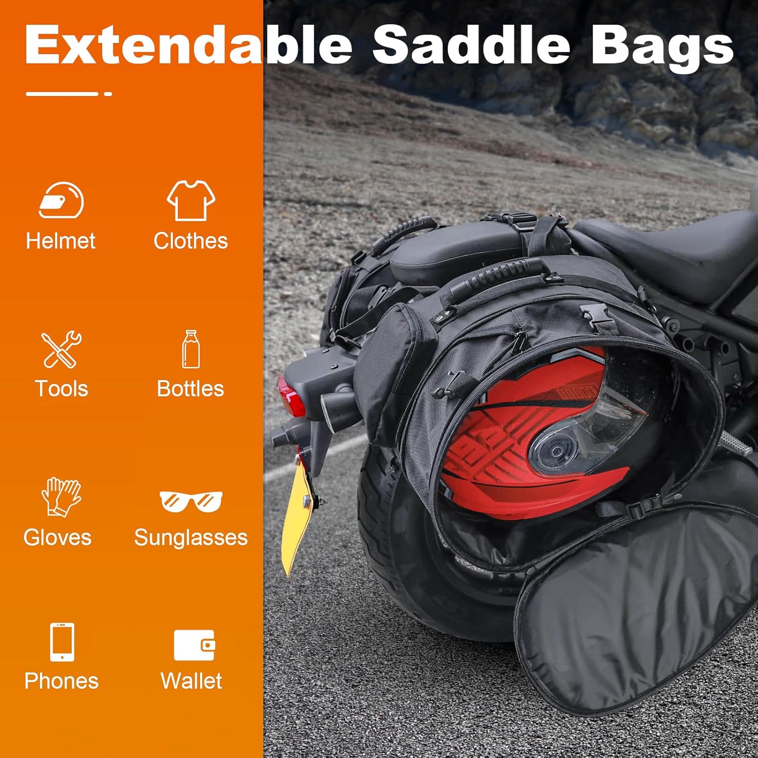 Motorcycle Saddlebags with Protective Cover, Large Capacity Extendable Saddle Bags Motorcycle Side Bag with Reflective Strip