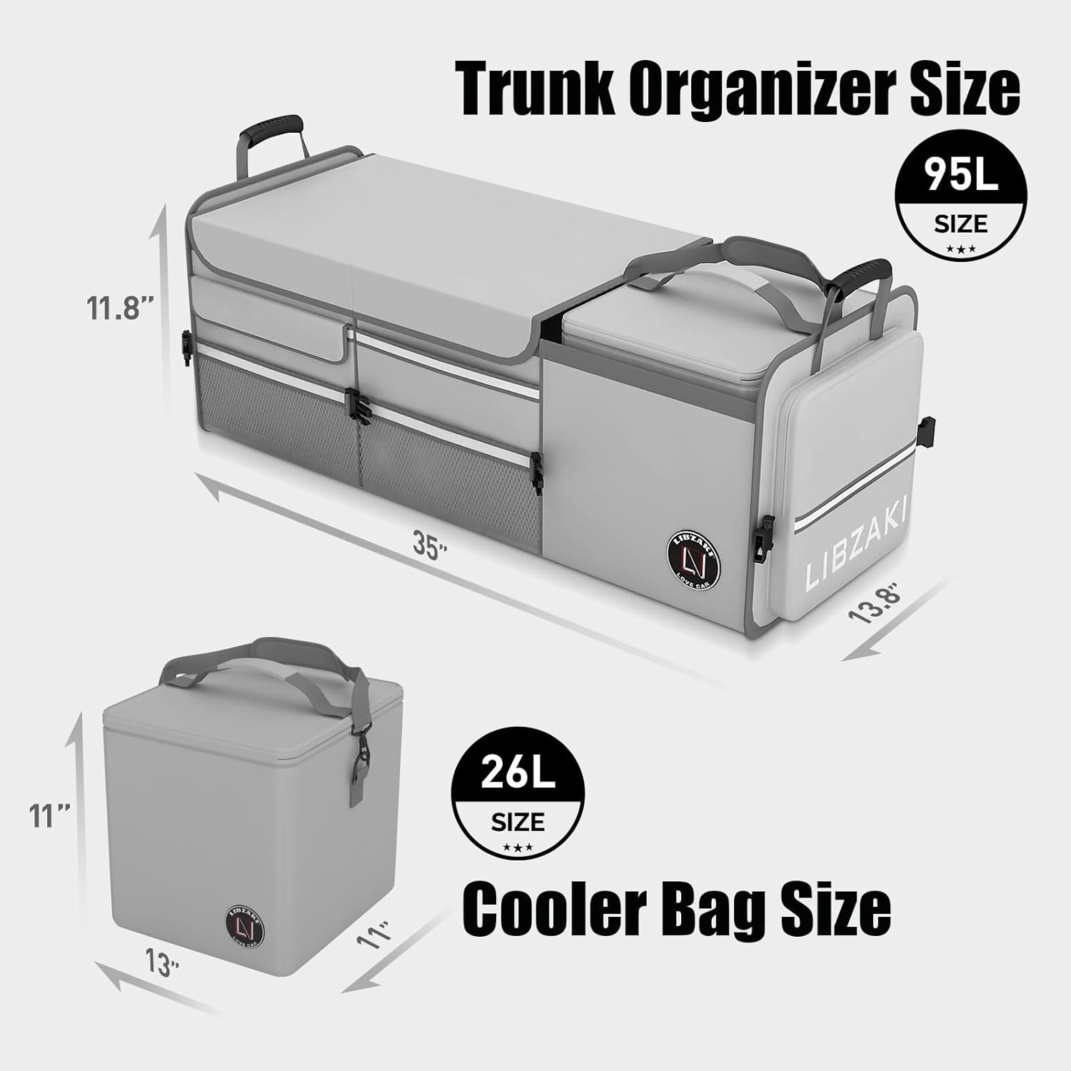 LIBZAKI Oversize 4 in 1 Car Trunk Storage Organizer, Multi Compartment Collapsible Trunk Storage Box with Cooler Bag for Car Truck SUV-Gray