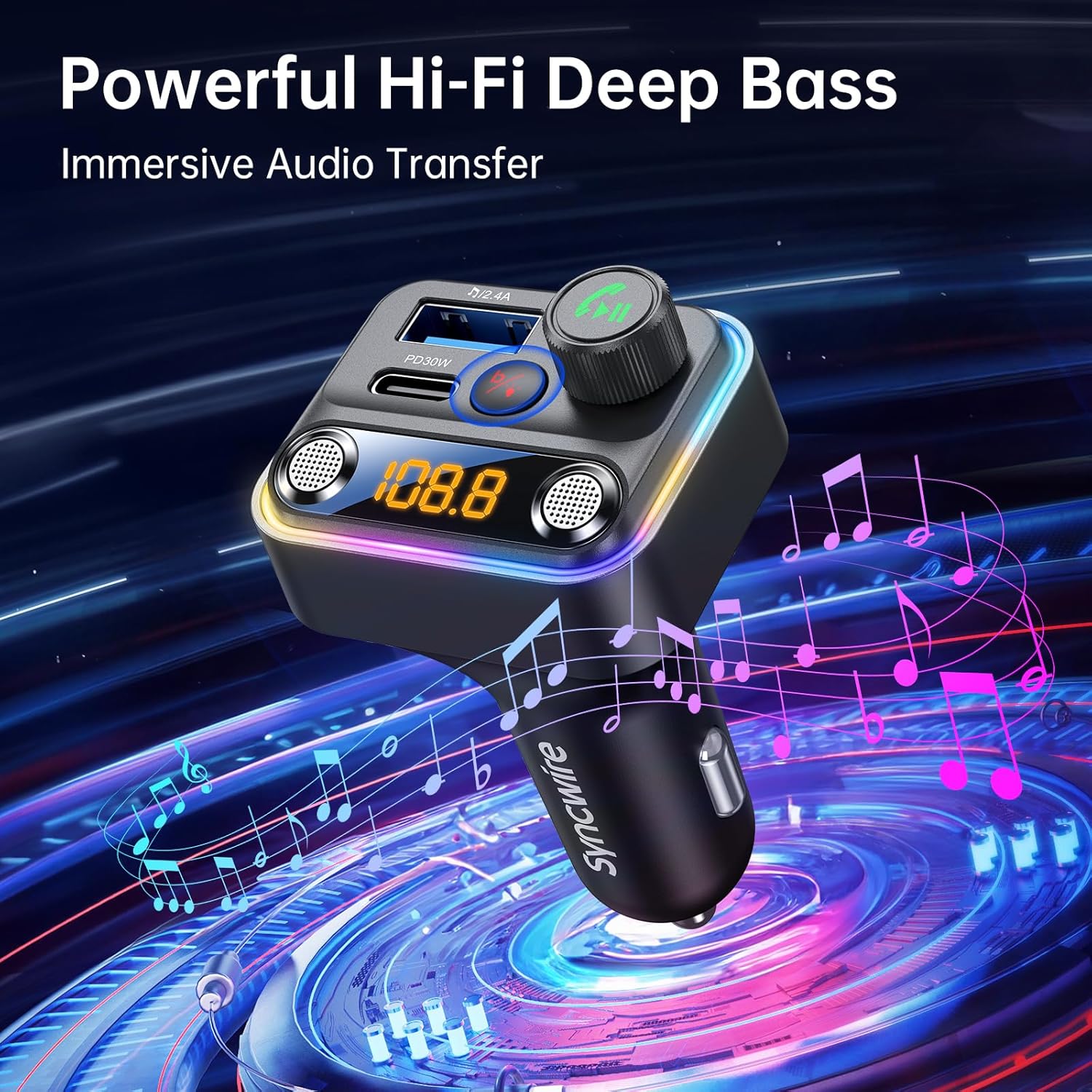 Syncwire Bluetooth 5.4 FM Transmitter Car Adapter 42W [Light Switch] [Stronger Dual-mic] [HiFi Bass Sound] [Fast Charging] Wireless FM Radio Stereo Music Adapter Hands-Free Calling Support USB Drive