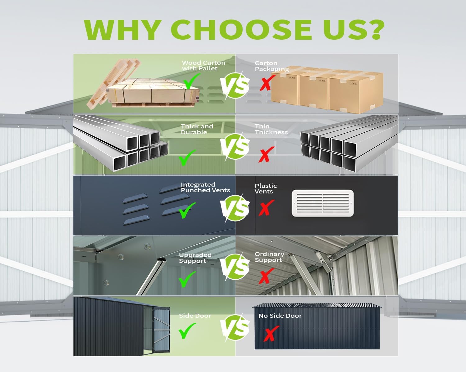 - 🏡Durable & Sturdy Frame: Durable construction with galvanized steel reinforcement makes this 20x13 storage buildings and sheds rustproof, UV-resistant and moisture-proof. The metal garden tool shed with reinforced thick metal beams and reinforced brace to support the roof, which can easily cope with all kinds of harsh weather and has a long service life.