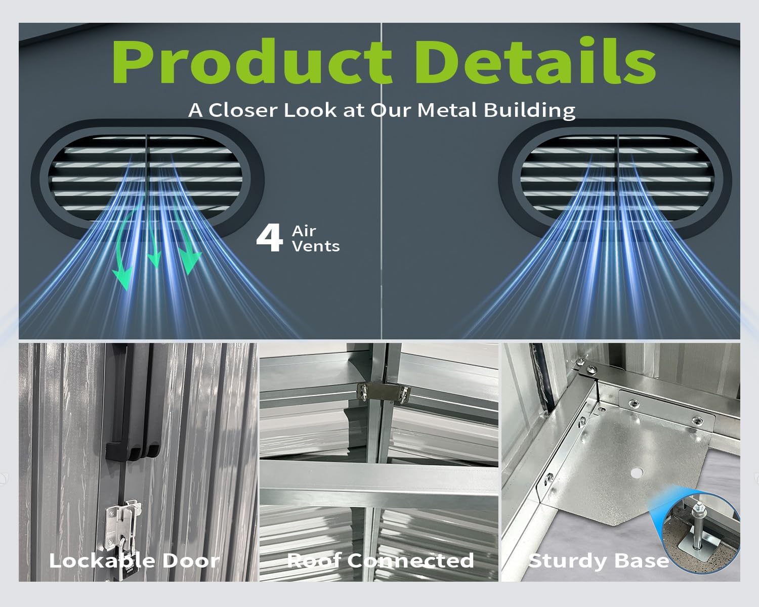 - 🏡All-weather Metal Shed: This huge outdoor storage shed is waterproof with a sloped roof, effectively preventing leakage or accumulation from heavy rain or snow. It features 4 vents for improved air circulation, keeping your tools in good condition. The sloping roof and lockable door also help prevent odors and reduce moisture. With a lockable design, this tool shed provides hidden storage space.