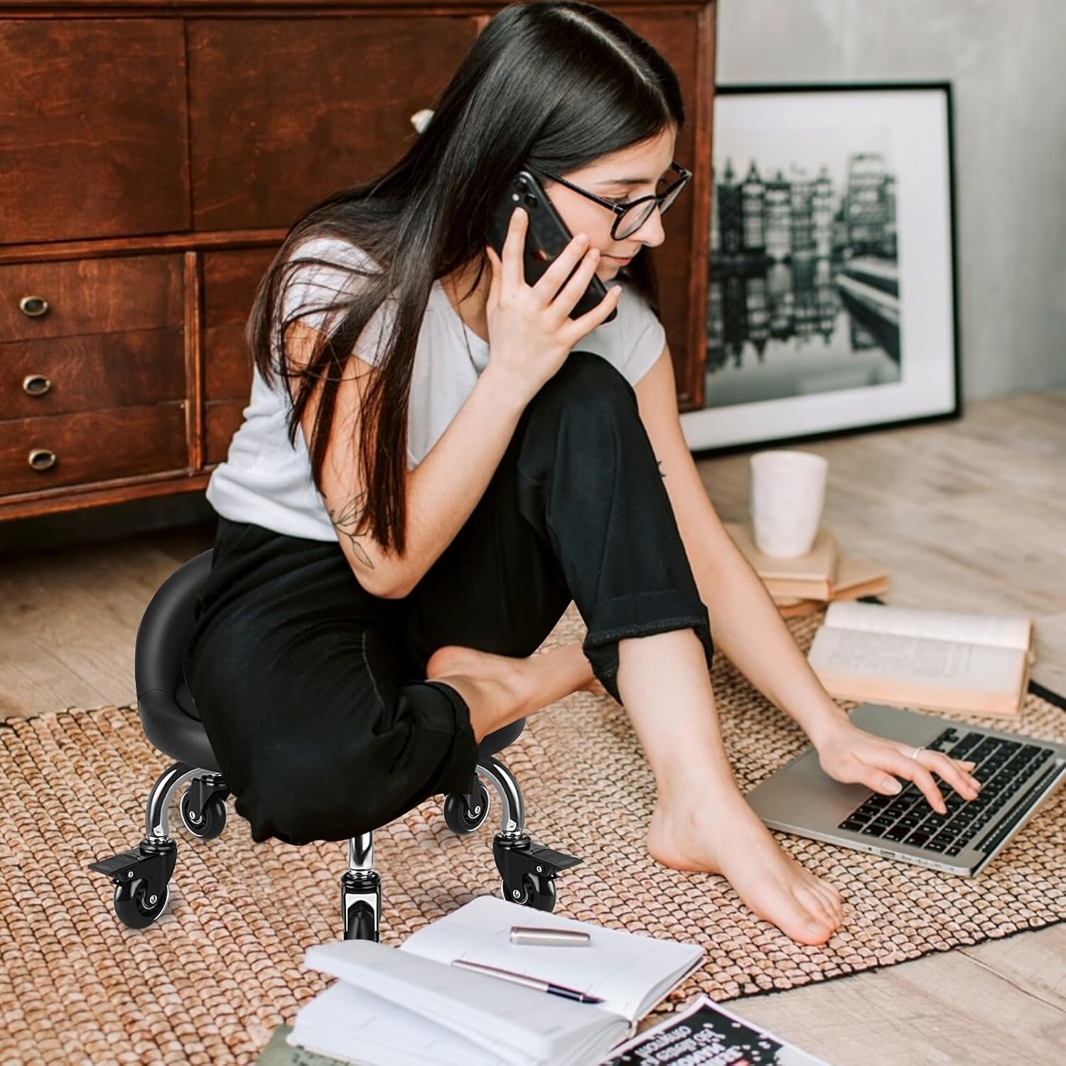 - â¨ăHigh-QualityăLow rolling stool with backrest is made of PU leather material, which is waterproof durable and easy to clean. Soft and comfortable seat cushion and backrest, thickened sponge filling will feel comfortable during sitting. and restored prototype quickly when the weight depart.